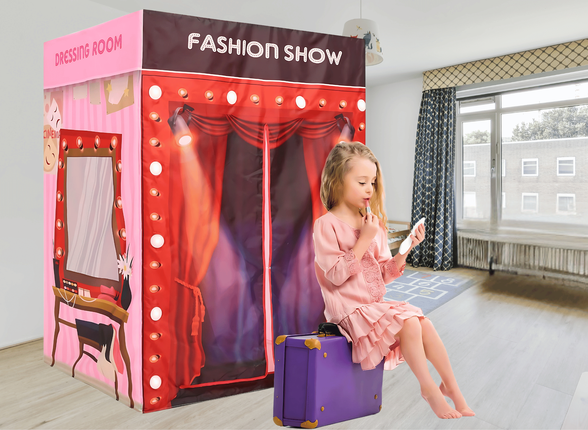 Equipped with multiple light holders on its façade (batteries not included), this play tent resembles a real fashion stage. The soft glow from the lights adds a magical ambiance that enhances imaginative play. Whether hosting pretend fashion shows, playing dress-up, or reading quietly under its glow, the tent transforms playtime into a grand event.