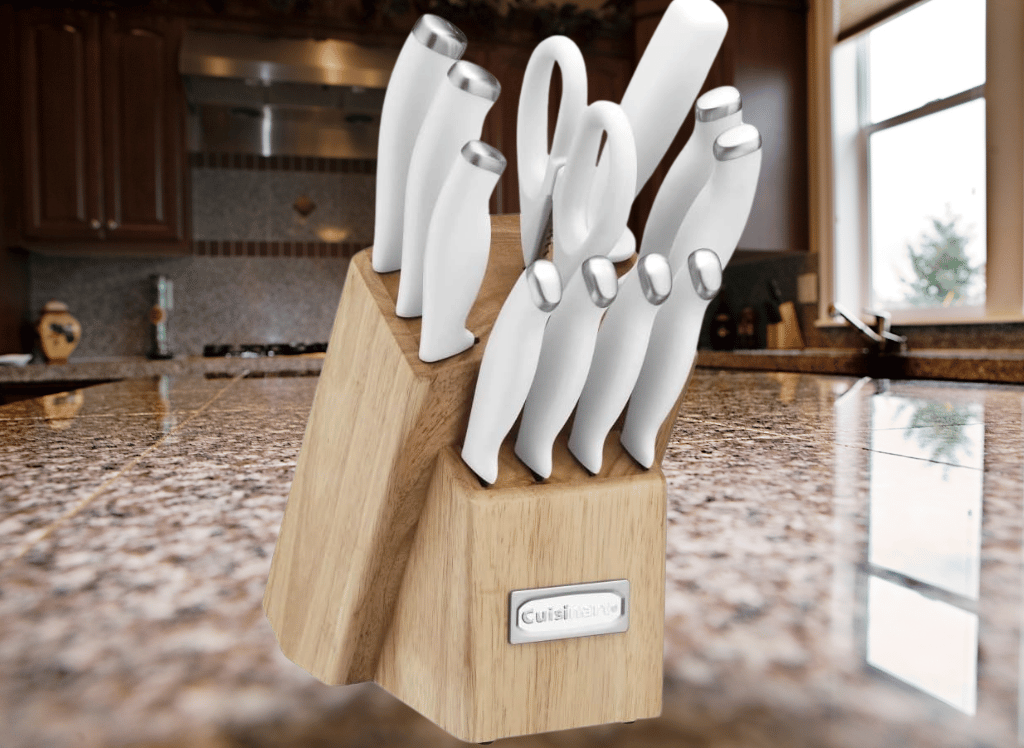 It also comes with two pairs of kitchen shears and a hardwood block with a built-in sharpener for easy storage and accessibility.