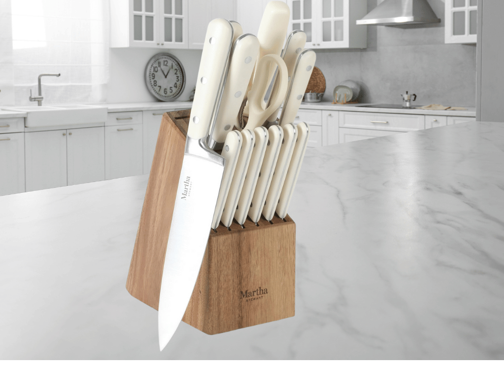 The Martha Stewart Eastwalk High Carbon Stainless Steel Cutlery Knife Block Set is the essential knife collection for any kitchen. This set includes 14 high-quality knives, carefully crafted with forged stainless steel and full tang construction for optimal balance and durability.