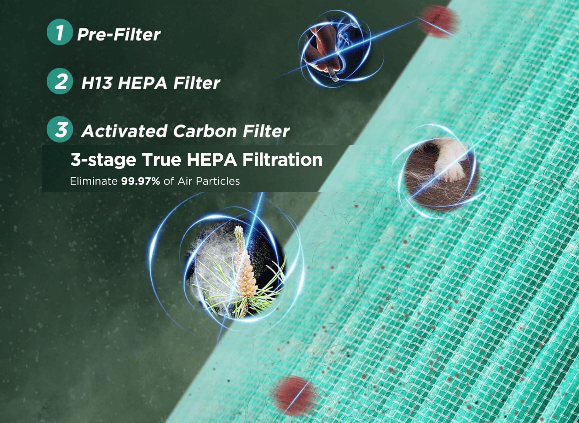 Widely regarded as the gold standard in air filtration, the H13 True HEPA filter captures 99.97% of airborne particles as small as 0.3 microns. This includes pollen, mold spores, and even smoke, making it ideal for relieving allergies and freshening indoor air.