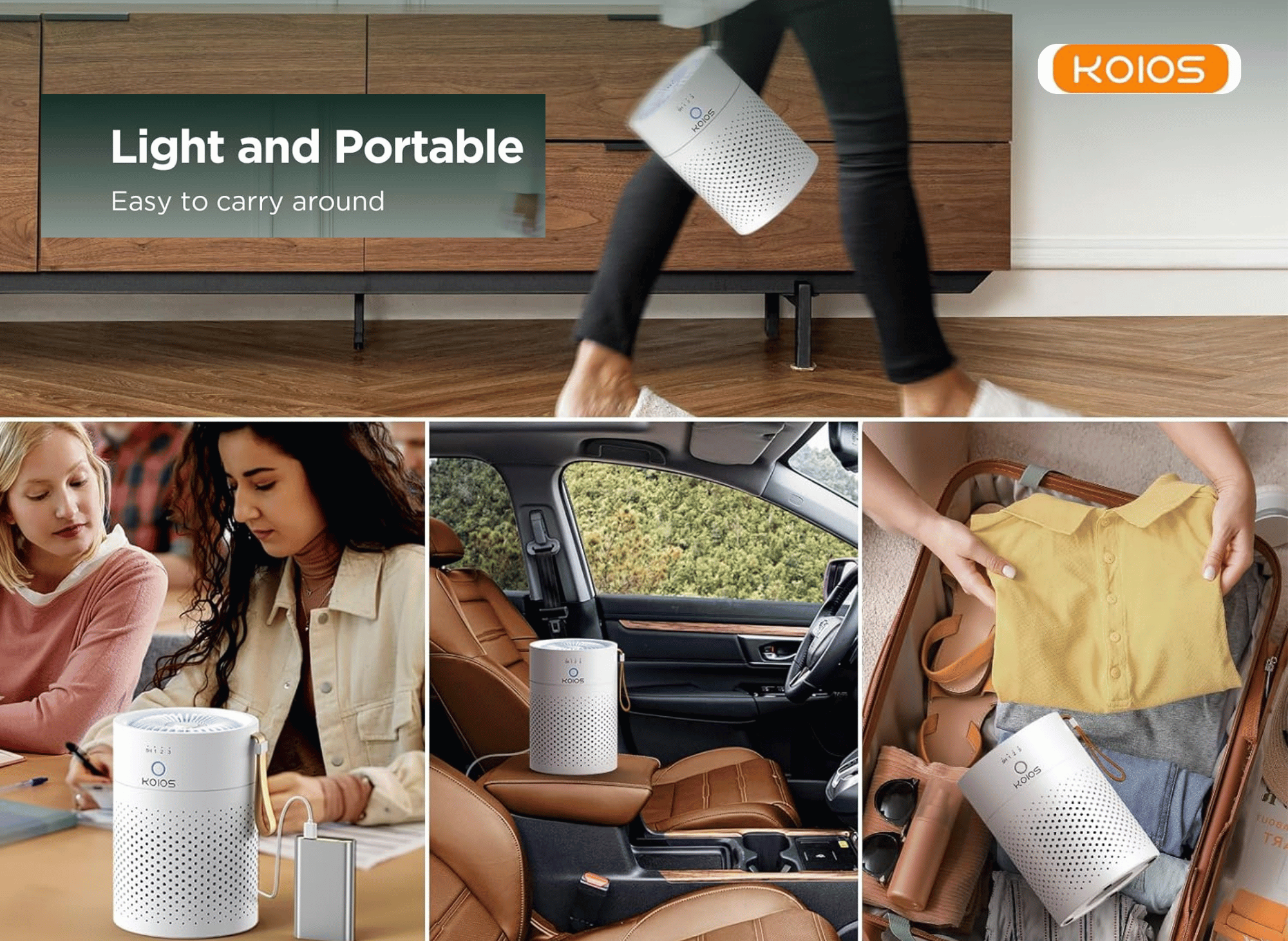 Weighing just 1.74 pounds and compact (5.3 x 7.6 inches), the KOIOS Air Purifier is your go-anywhere clean air solution. It's built-in handle makes it easy to move from your desk to your car, or even pack in your luggage for travel.