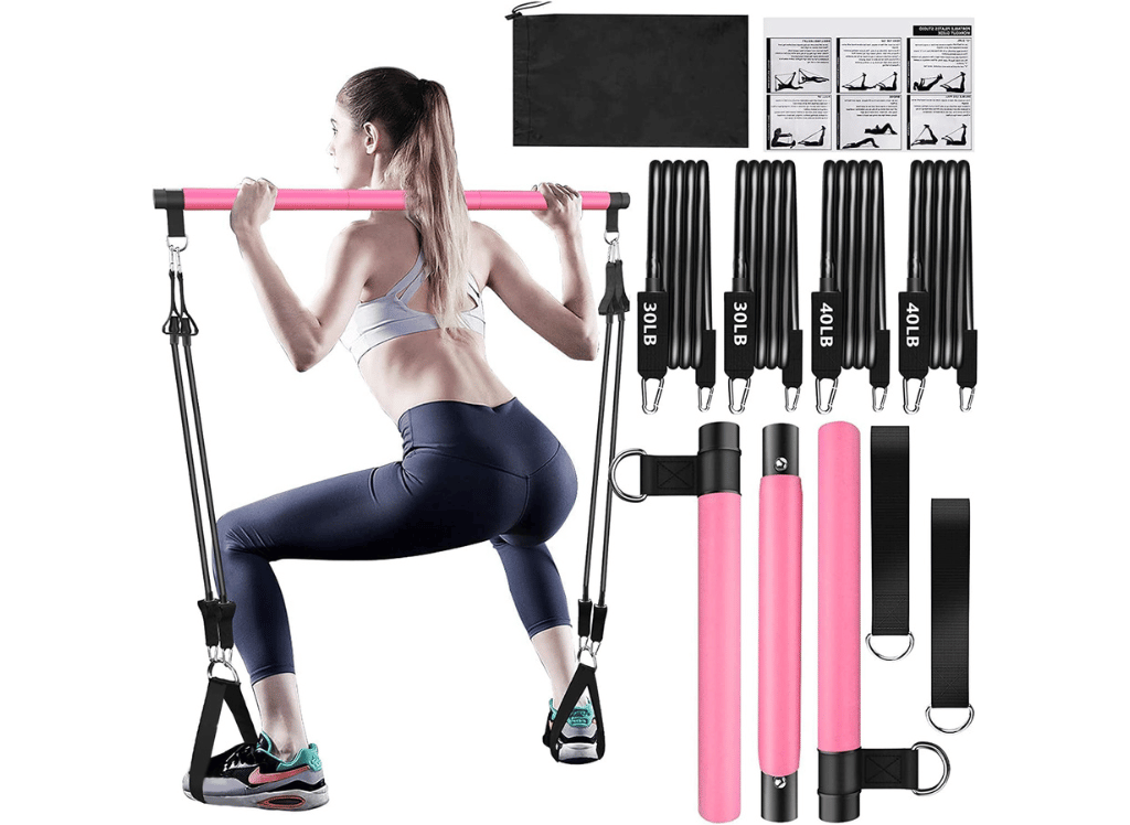 The Pilates Bar Kit with Resistance Bands is an all-in-one workout equipment that provides users with the ability to shape their bodies, train muscle groups, and improve overall fitness. It comes with two types of resistance bands - one for lighter weight and one for higher intensity - that can be attached to the sides of the bar.