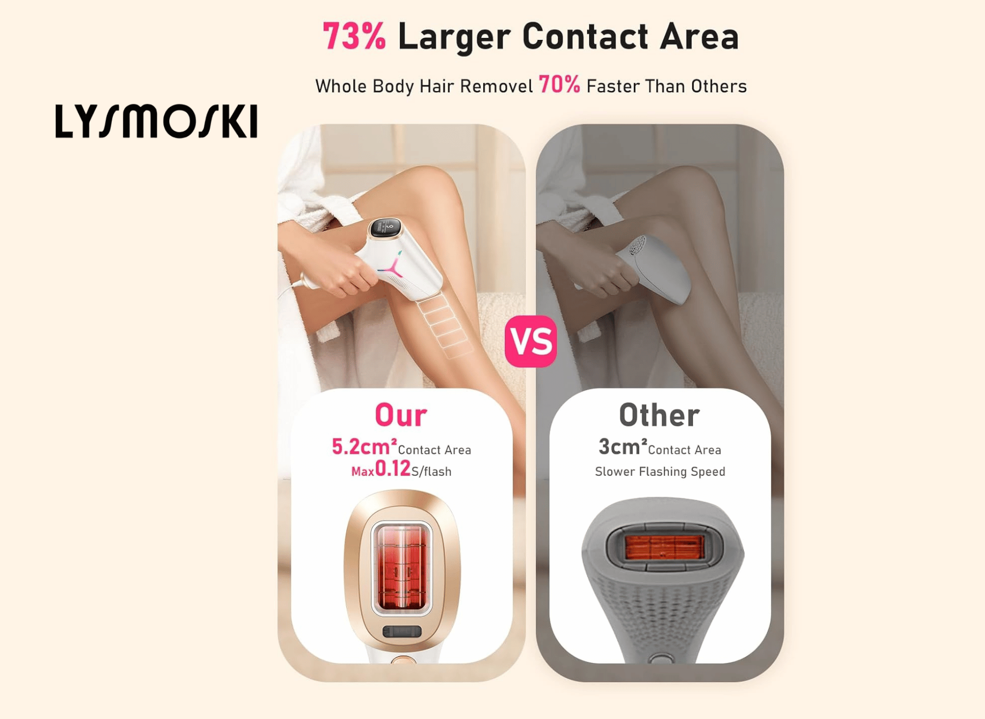 One of the biggest complaints regarding at-home IPL is how long it takes to treat large areas like thighs or shins. Standard devices often have small flash windows, meaning you have to stamp the device hundreds of times to cover a leg. The LYSMOSKI features an upgraded 5.2 cm² treatment window. This is over 70% larger than many standard devices on the market. A larger window means more skin is covered with every single flash, drastically reducing the total time you spend on your beauty routine.