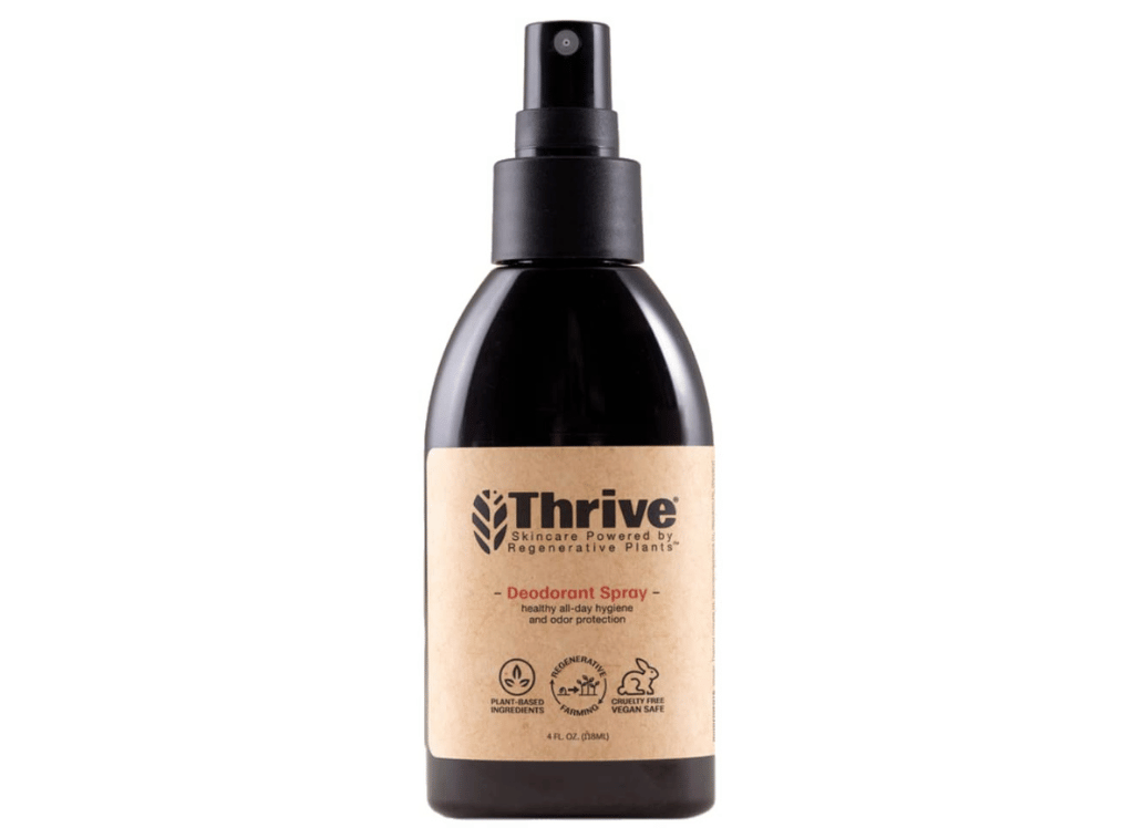 Thrive Natural Deodorant Spray is aluminum-free and powered by Thrive’s antioxidant-rich Costa Rican super-plants, Juanilama & Fierrillo. Its regenerative plant-derived formula helps reduce irritation and redness while helping restore, heal & protect you're under-arm skin. It’s gentle and safe for sensitive skin, leaving no residue, white patches, or sticky feeling. Plus, it has a fresh, subtle, sophisticated scent for men & women. It’s also cruelty-free, vegan, PABA-free, GMO-free, and paraben-free, and it has no synthetic colors, fragrances, or ingredients. Thrive Natural Deodorant Spray is the perfect choice to stay fresh and odor-free all-day