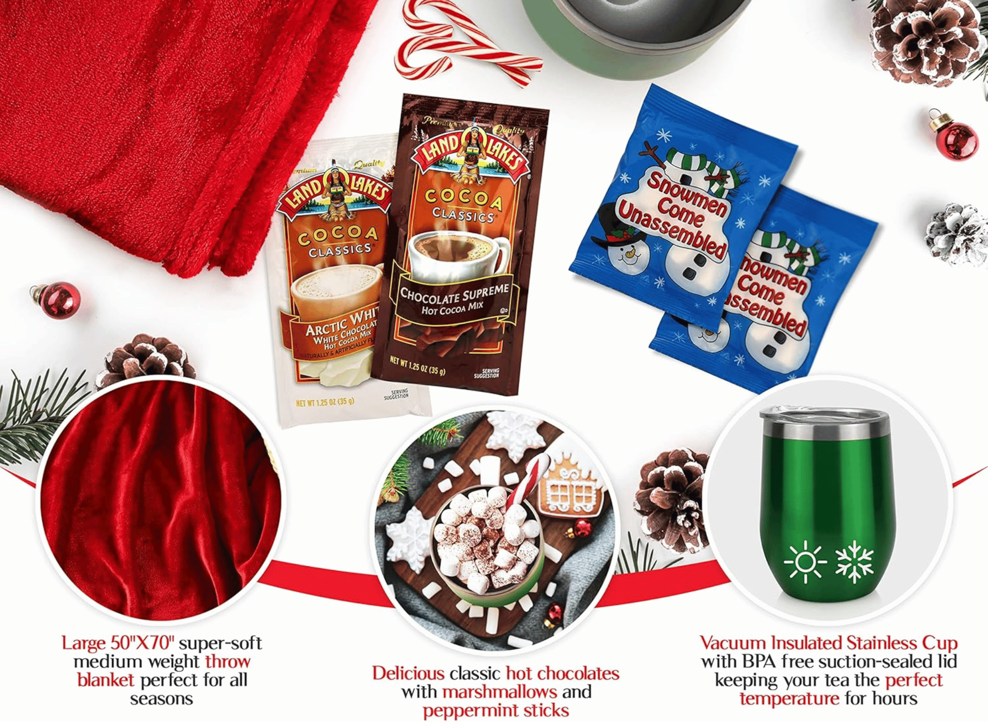 Wrap Yourself in Holiday Cheer with the Michael Grace Gifts Christmas Blanket Set. Bring warmth and joy to your loved ones this festive season with the Michael Grace Gifts Christmas Blanket Set—the ultimate holiday gift that combines cozy vibes and delightful treats! This beautifully curated set includes a luxuriously soft, plush red throw blanket (50” x 70”), perfect for snuggling up on the couch or in bed while enjoying your favorite holiday classics.