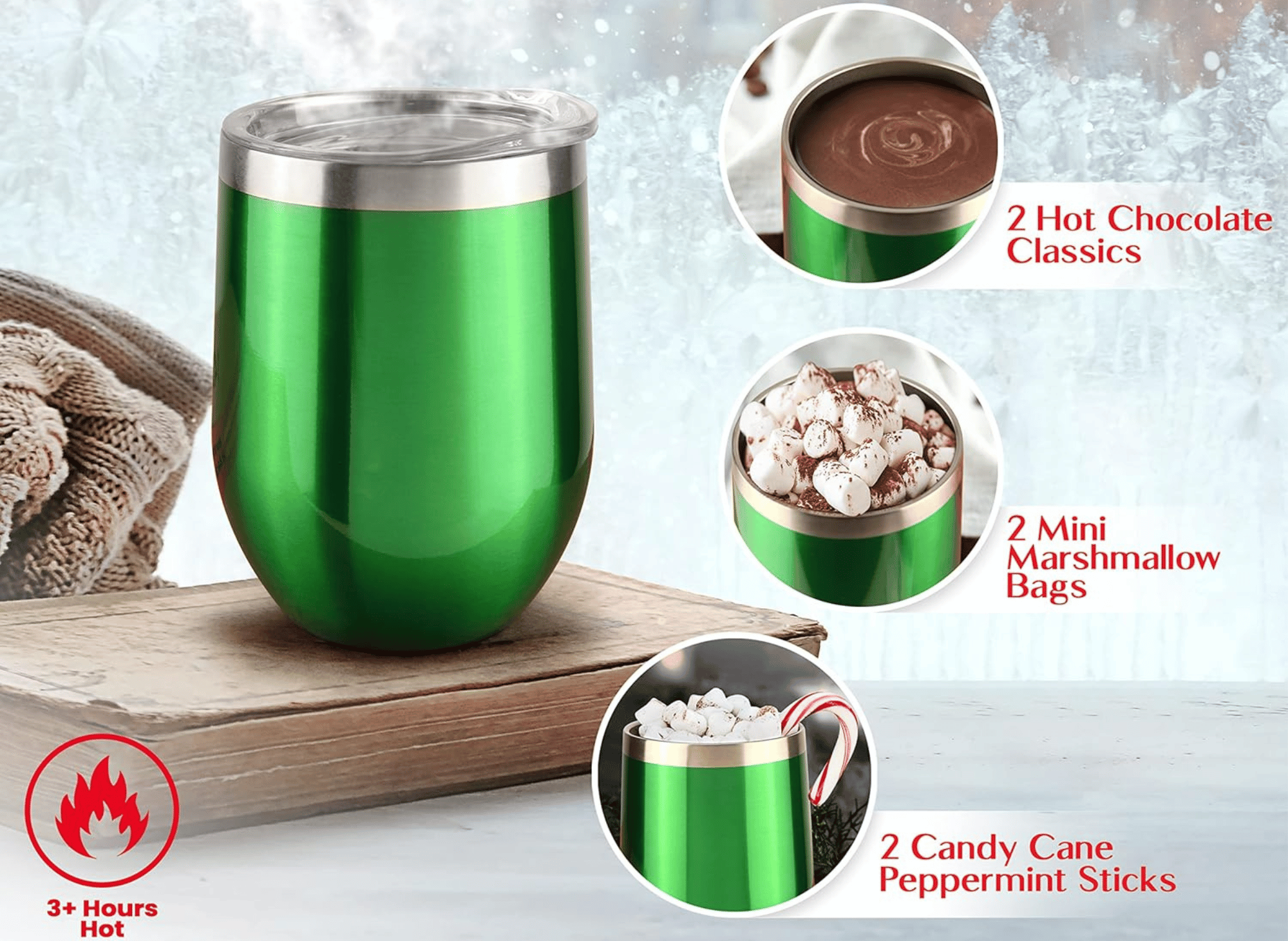 But the magic doesn’t stop there. Sip on perfectly warm beverages with the 12oz double-insulated stainless steel mug, which keeps drinks at the ideal temperature for hours. Pair it with one of the two included hot cocoa flavors—Chocolate Supreme or Arctic White Chocolate—topped off with mini marshmallows and peppermint candy canes for the ultimate holiday indulgence.