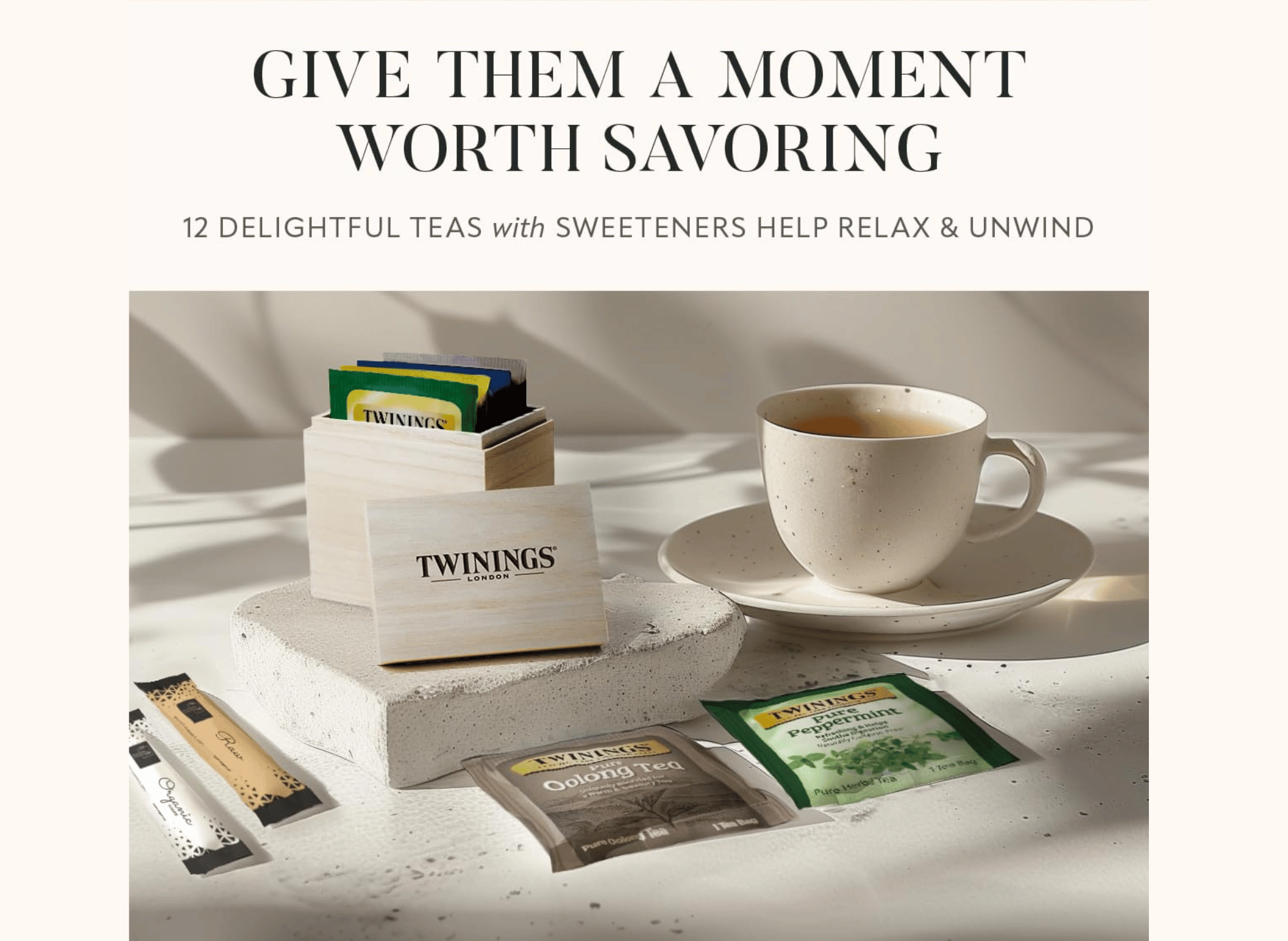 Enrich your senses with 12 globally sourced Twinings tea flavors, spanning black, herbal, white, green, and cold-brewed teas, expertly paired with a 12-piece natural sweetener variety pack featuring raw, organic, and stevia options.
