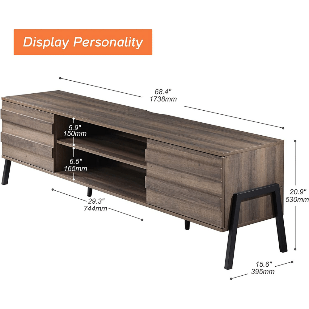 The WAMPAT Television Stand is designed with 68.4" L x 15.6” W x 20.9" H to accommodate TVs up to 80 inches in size. The stand is made from high-grade certified MDF for long service life and finished with a smooth, waterproof, and odorless coating that makes it easy to clean. With a weight limit of 275 lbs on the top board, it is perfect for your family portrait, decorations, or plants. The push-to-open cabinet doors provide additional privacy to store your belongings. At the same time, the height adjustment of the open shelf allows you to personalize its use according to your needs.