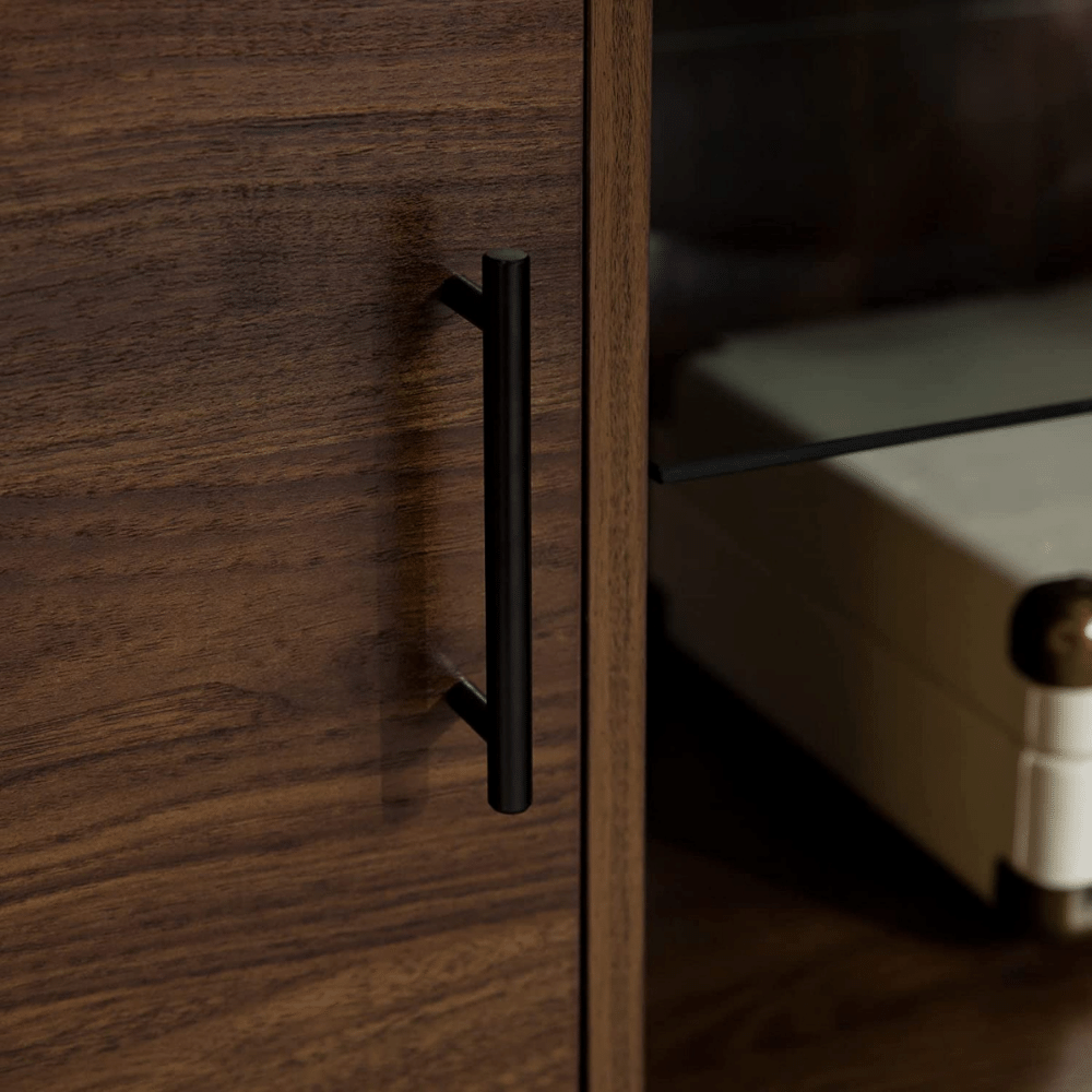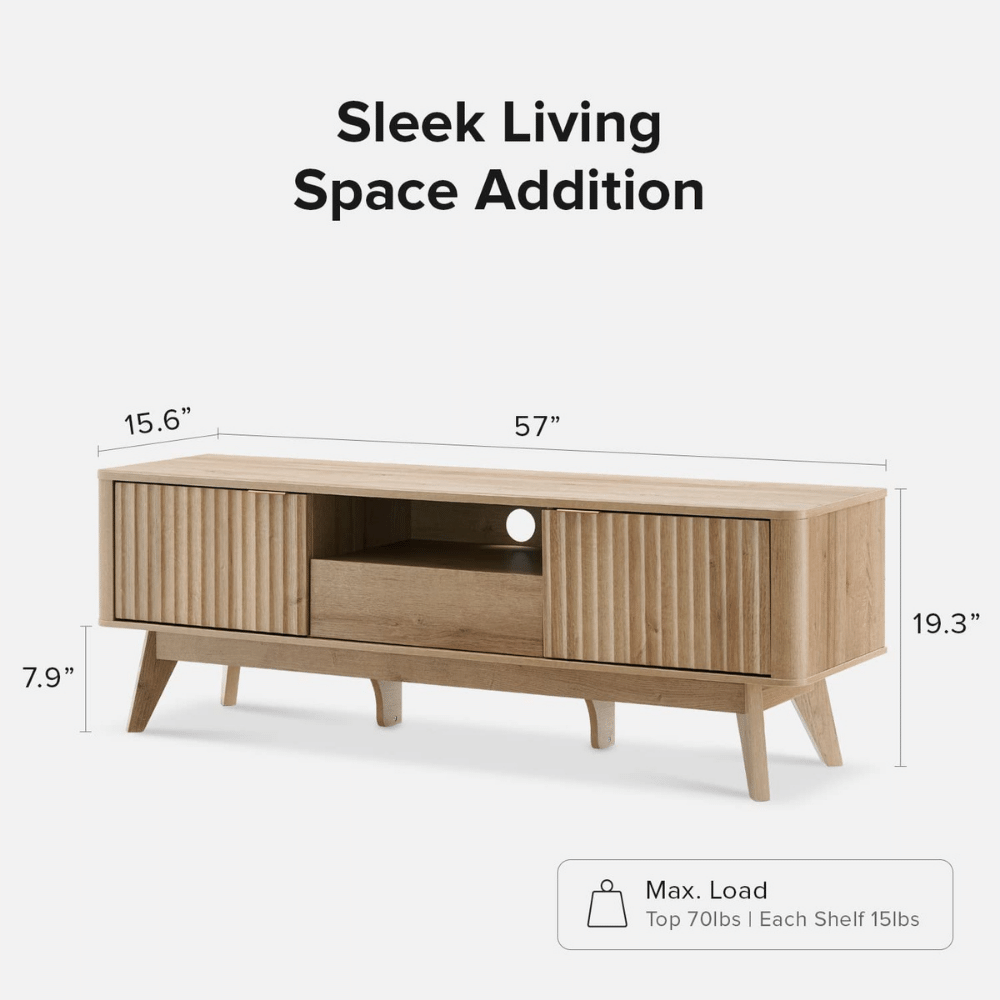 The WLIVE Mid Century TV Stand features a sleek, modern design that will complement any décor. It has soft-close hinges to close quietly and without pinching your fingers. The two side cabinets provide plenty of storage space for your media components, DVDs, or Blu-rays.