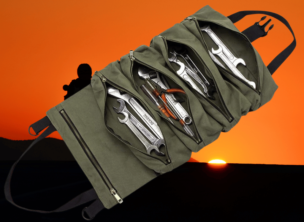 The Super Roll Tool RVersatile Purpose Survival Kit Tool Pouches is an excellent canvas tool bag with zipper pockets that can carry a variety of tiny pliers, wrenches, screwdrivers, sockets, tire gauges, or flat tools and ratchets.