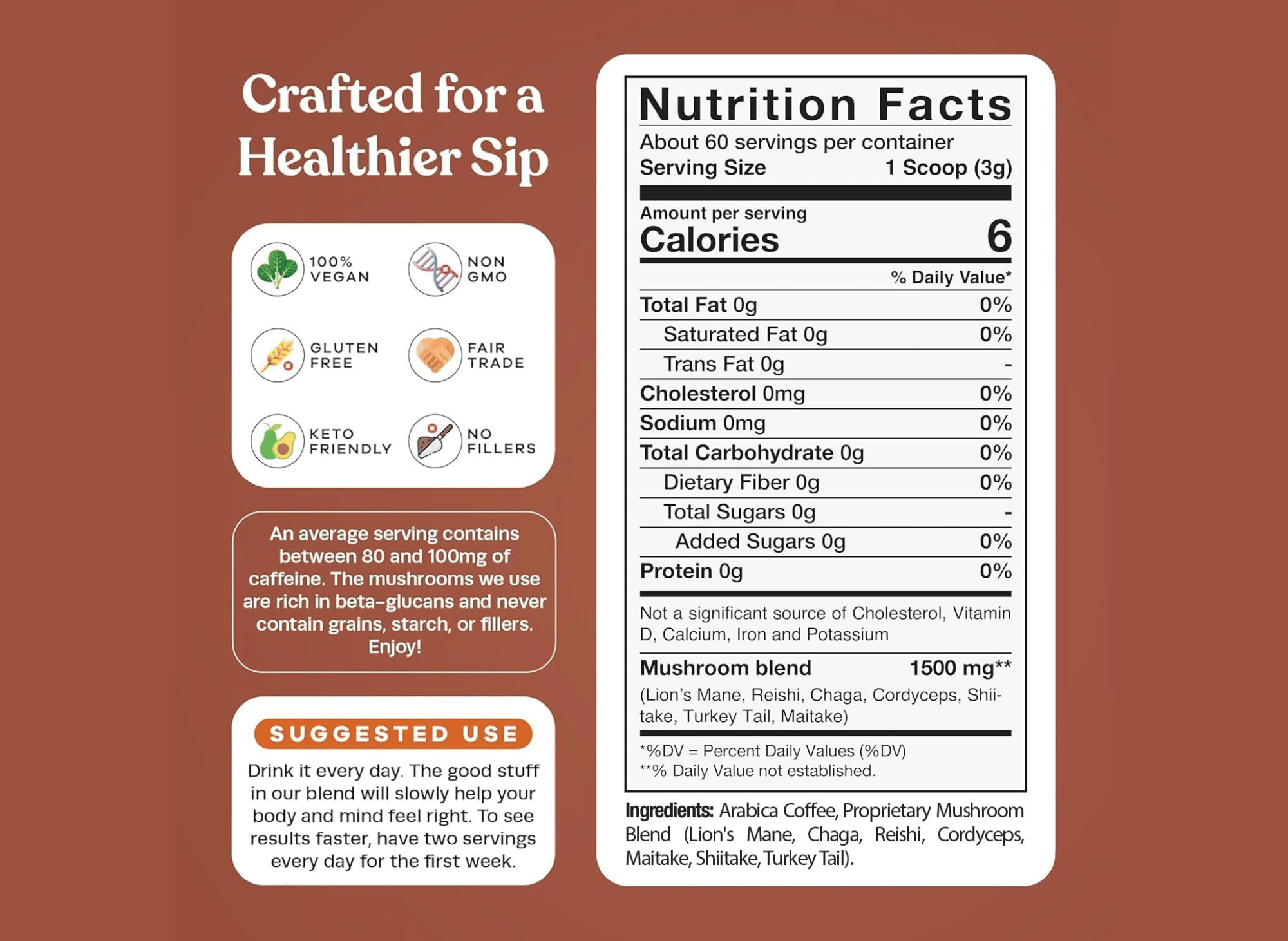It's also important to note that mushroom coffee products are sold as dietary supplements, not medicines. The FDA has not evaluated the health claims associated with medicinal mushrooms, and these products are not intended to diagnose, treat, cure, or prevent any disease. The health benefits discussed here are based on consumer feedback and available research, not clinical endorsement.