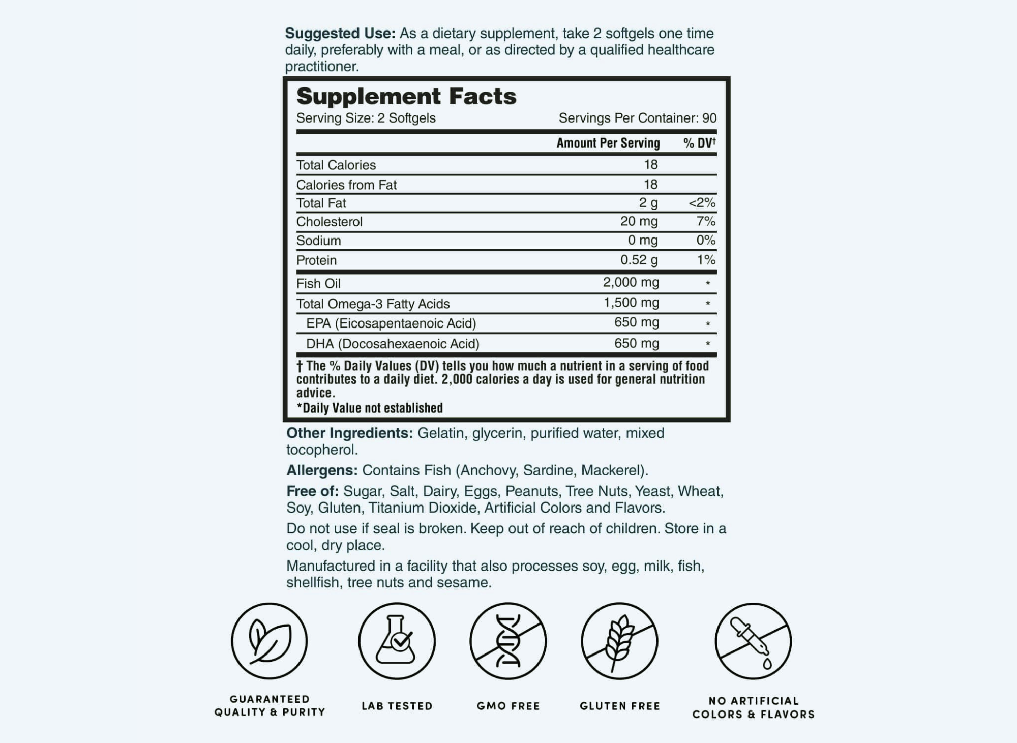 Sourced from wild-caught sustainable fish, each serving is packed with three times the amount of EPA and DHA compared to standard supplements. This potent concentration not only supports healthy blood flow and circulation, but also promotes immune health, joint health, and skin health—helping you maintain overall vitality and well-being.