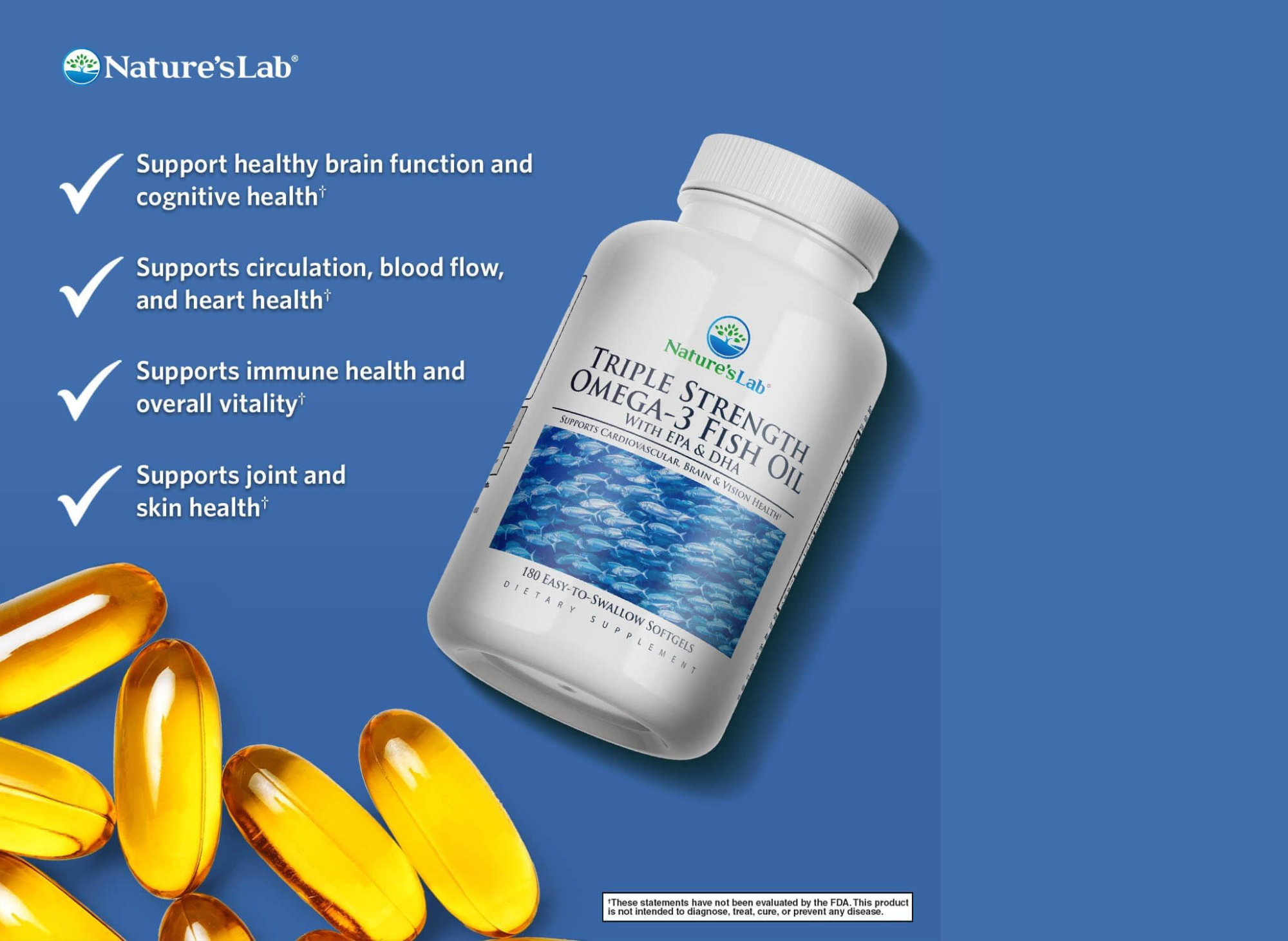 When comparing supplements, you will quickly notice the difference between Nature's Lab fish oil and a conventional strength fish oil. Our triple-strength omega-3 formula provides essential omega-3 fatty acids at three times the amount found in standard options.