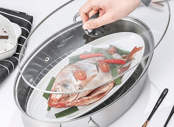 Cast iron pans can also be used for steaming, as long as they have a well-seasoned surface that won't react to the dish's ingredients. When selecting your pan, make sure it's large enough to fit the size of your fish so that it cooks evenly!