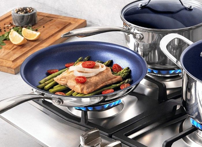 The Granitestone Blue Non-Stick Frying Pan is the perfect kitchen companion for all your cooking needs. It is crafted from triple-reinforced stainless steel and coated with a strong, long-lasting nonstick coating that won't stick to food or sauces even after years of use, without needing oils or kinds of butter for extra slickness.