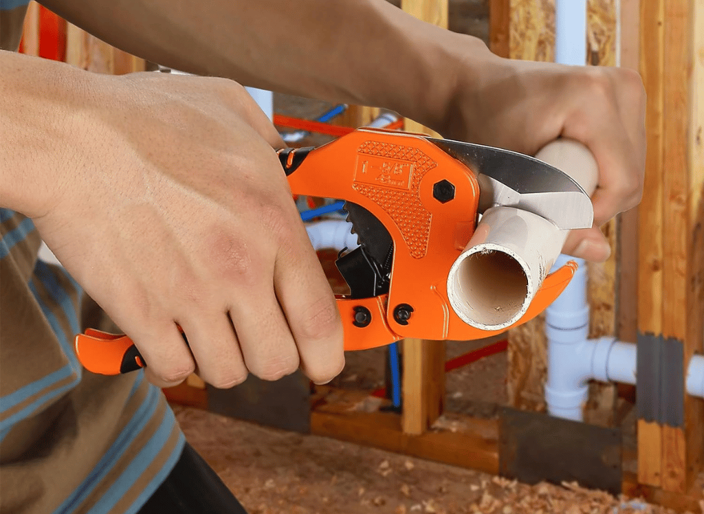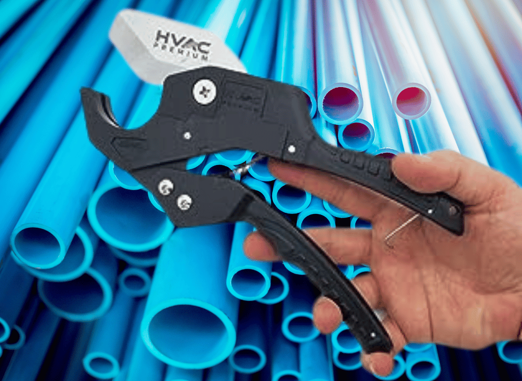 A pipe cutter is a tool used to cut through plastic pipes. It is a handheld device with a sharp blade that rotates around a circular cutting edge. This allows the user to make clean cuts through the PVC pipe easily.