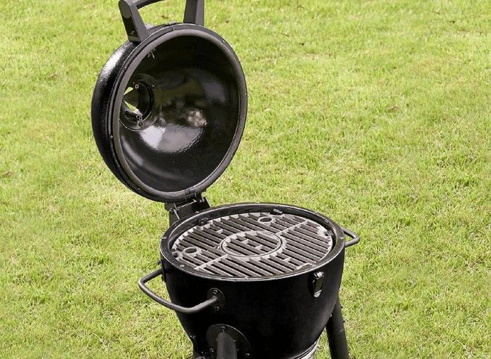 This kamado-style portable grill and smoker features a heavy-duty construction made from powder-coated steel for maximum durability and an insulated design that locks in smoke, heat, and moisture like expensive ceramic kamados – allowing you to use less charcoal while still achieving flavorful barbecue. The thick cast iron cooking grates ensure excellent heat retention for evenly cooked meals every time.