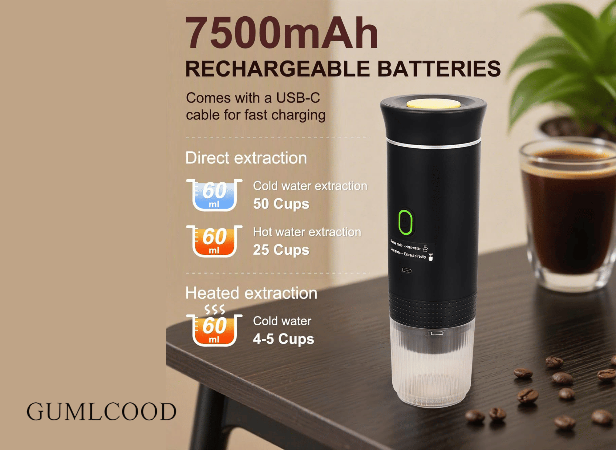 The 7500mAh battery handles 3–5 full heating extraction cycles per charge, or up to 50 brews when using pre-heated hot water. The self-heating tech brings room-temperature water up to 198°F (92°C) in 300 seconds, hot enough for proper espresso extraction.