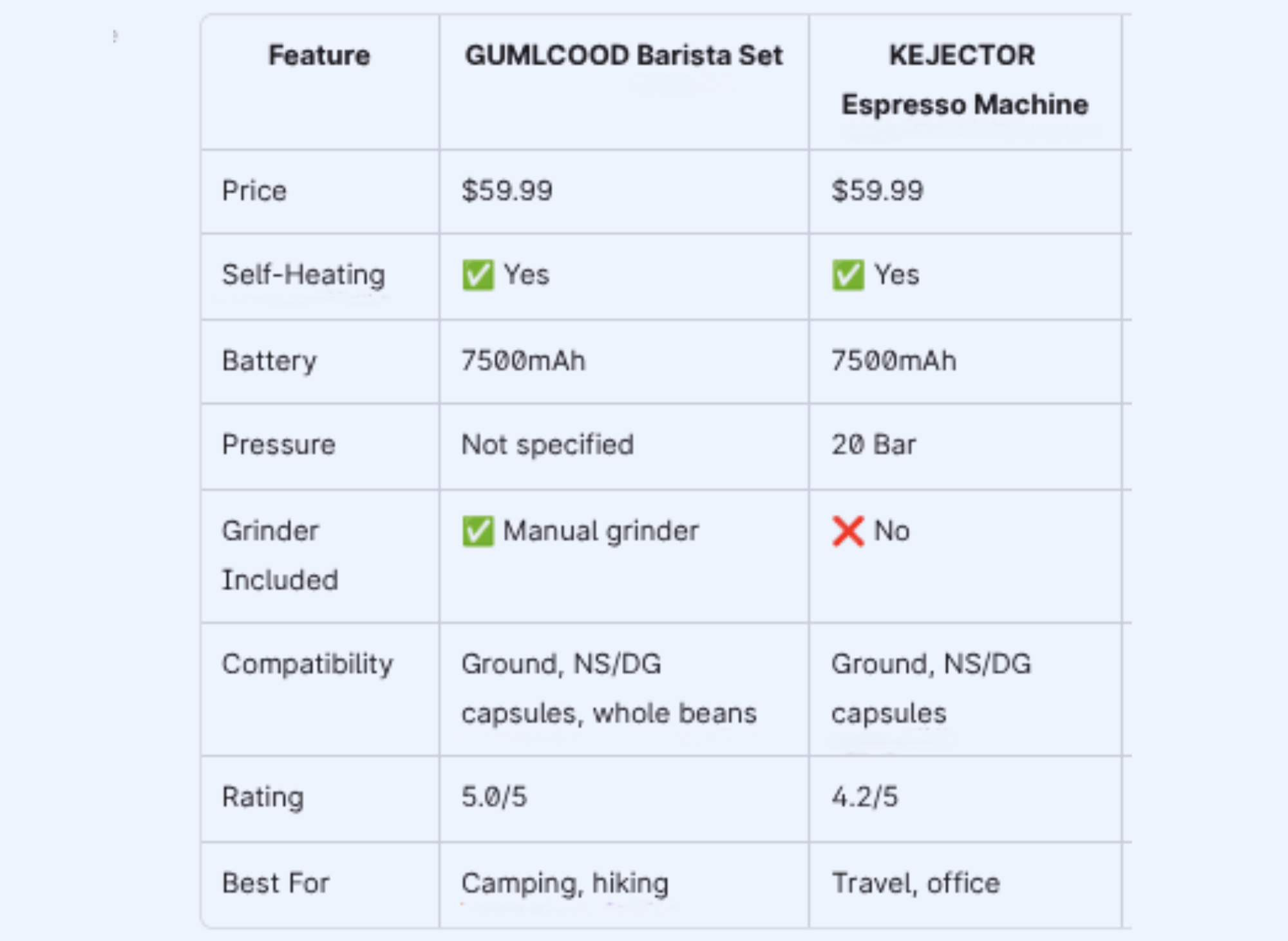 Camping and hiking: Go with the GUMLCOOD. The built-in manual grinder lets you pack beans instead of pre-ground coffee, which stays fresher longer. The self-heating tech means no kettle, no campfire required, just cold water and a charged battery.