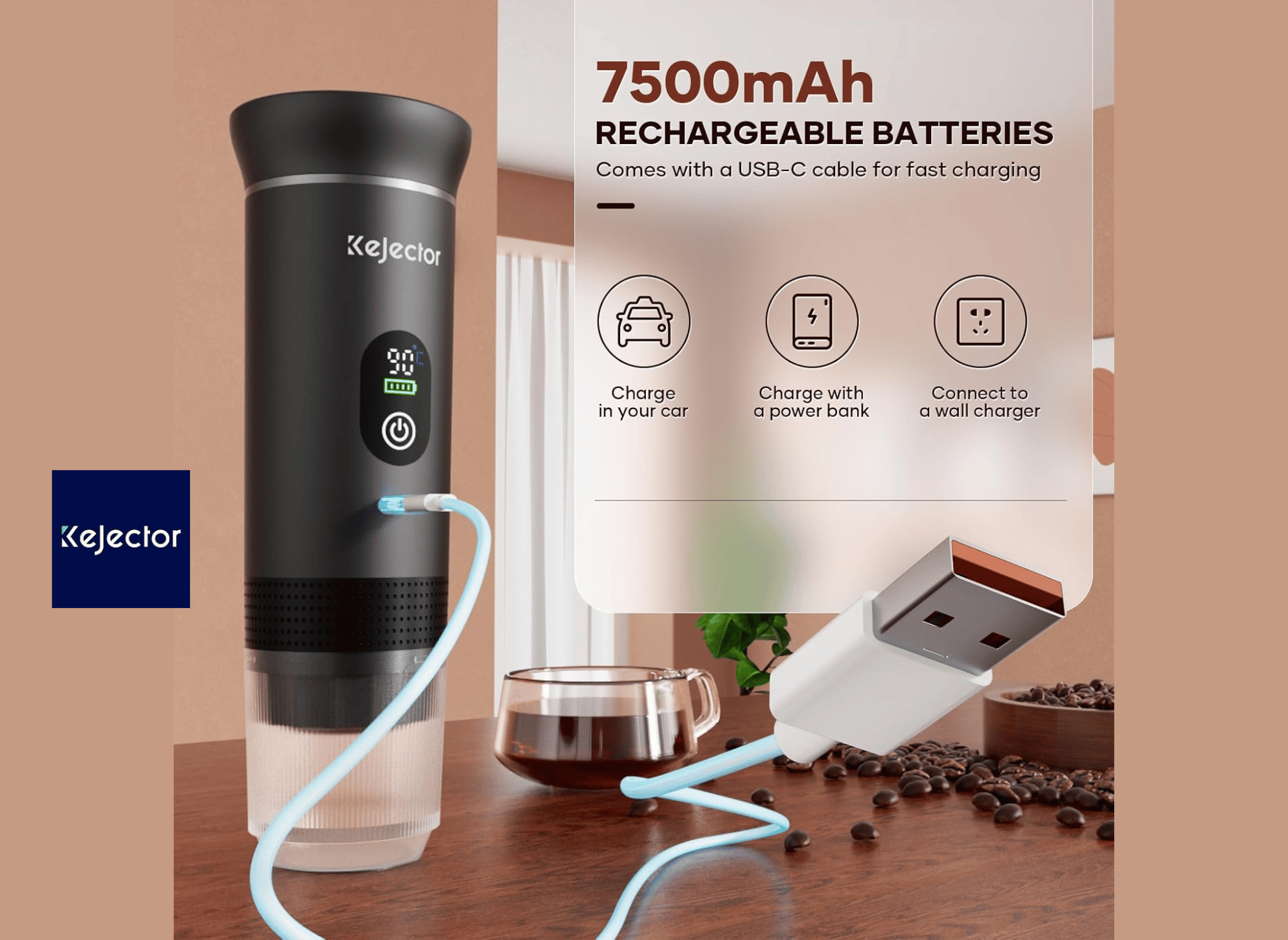 Like the GUMLCOOD, the KEJECTOR runs on a 7500mAh rechargeable battery via USB-C. It heats 1.7 oz of cold water to 201°F (86°C) in under 300 seconds, and supports up to 4 espresso shots per charge using cold water, or 50+ brews with hot water. For a quick double shot in the morning, this machine rarely needs charging more than once or twice a week.