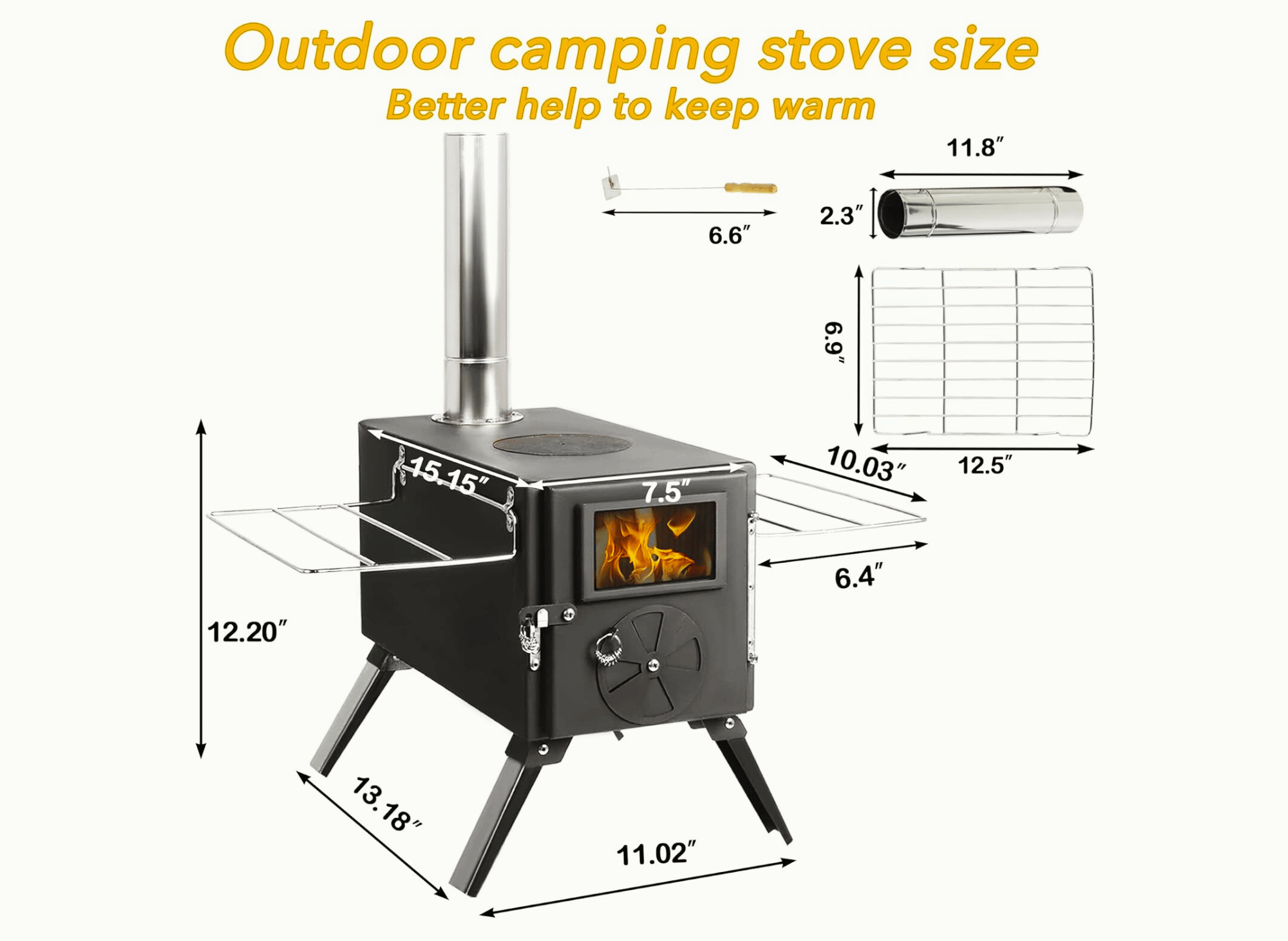 - Efficient Heating: Keep your tent warm and cozy with this wood stove, designed to provide consistent, controlled heat in cold weather conditions.