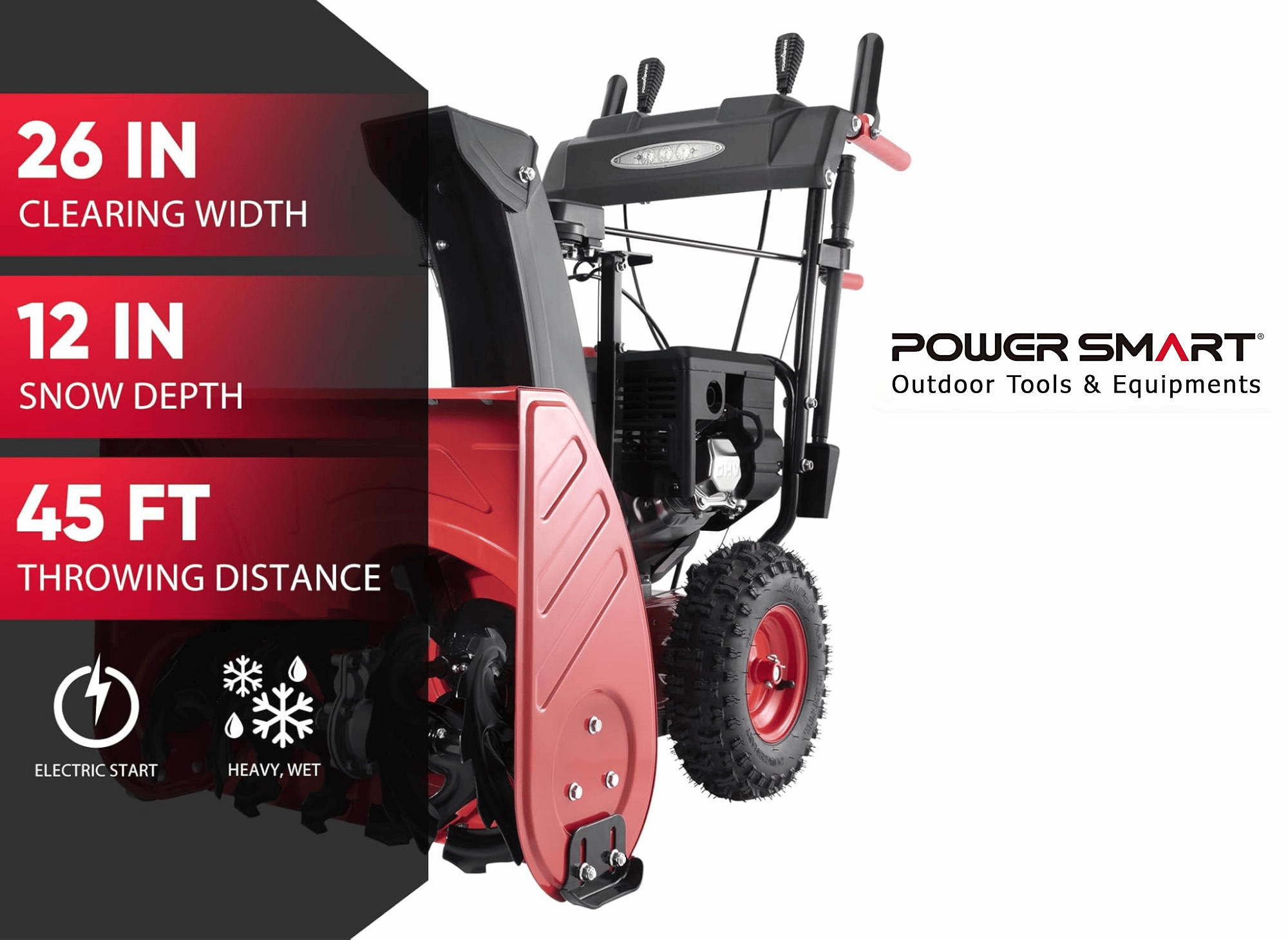 The PowerSmart Self-Propelled 2-Stage 26-inch 252cc Gas Snow Blower with Electric Start is the ultimate solution to tackling heavy snow in larger driveways., With its powerful 252cc 4-cycle OHV engine, this snow blower effortlessly plows through even the heaviest of snow, boasting a capacity of up to 2650 lbs/min. Its steel auger breaks up snow and its high-speed impeller launches it from the chute at a distance of 45 feet.