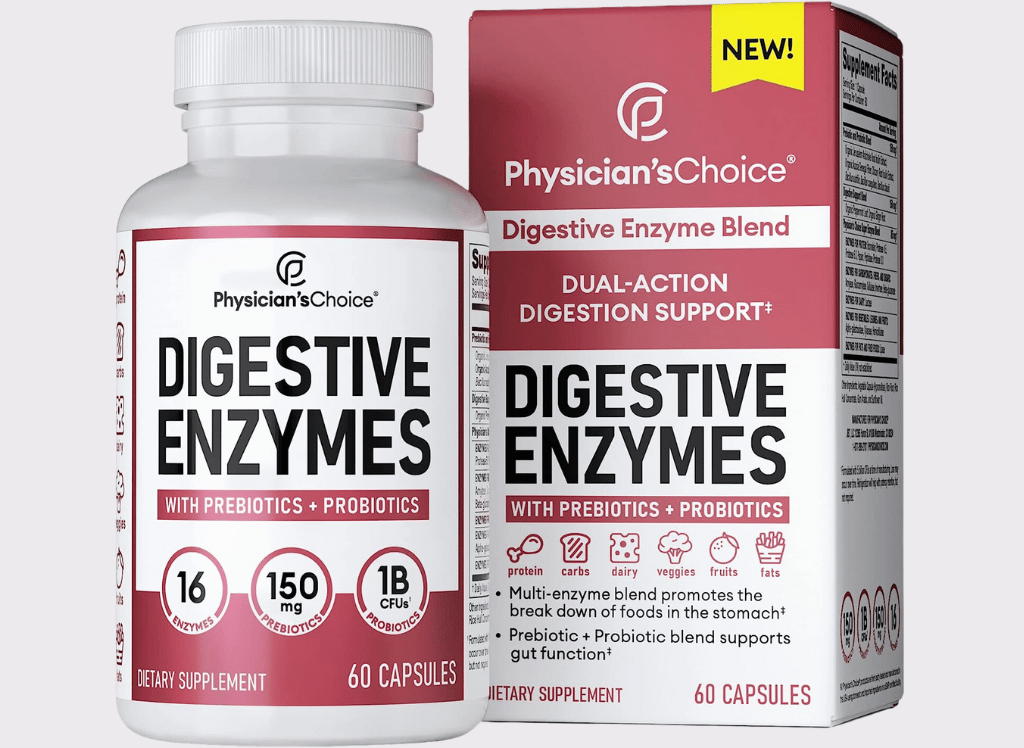 Physician's CHOICE Digestive Enzyme immune health probiotic is your ultimate mealtime hack! This powerful blend of 16 beneficial enzymes and probiotic & prebiotic formulations work synergistically to provide relief from mealtime discomfort. A unique combination of soil-based probiotic strains has been specifically selected due to their ability to survive the harsh gut environment, along with organic prebiotics that fuels the growth of healthy bacteria. Backed by science and partnered with expert physicians to help review their products & research, Physician's CHOICE Digestive Enzyme Probiotics is here to provide you with an informed decision regarding you and your family's health. With dual action relief and digestive enzymes that can aid in breaking down food from proteins, carbs, fruits, veggies, beans, dairy & fats, you can feel secure knowing that this comprehensive blend covers all diets and promotes digestive function in the gut. Give digestive health today with Physician's CHOICE Digestive Enzyme Probiotics!