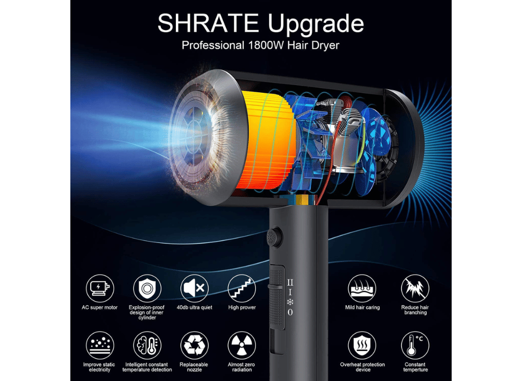 The SHRATE Hair Dryer is an advanced, high-performance dryer that boasts key features such as low noise levels, a dustproof back cover, and a temperature regulation system to prevent overheating.