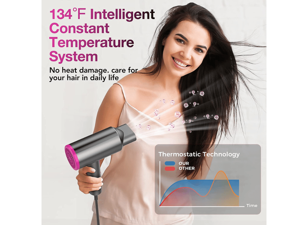 The included diffuser and double-layer anti-scald concentrator nozzle make it perfect for any hair type — whether thick, thin, curly, or straight. With its compact size of 5.3Dx2.5Wx7.8H inches, this hairdryer is easy to store and take with you on the go!