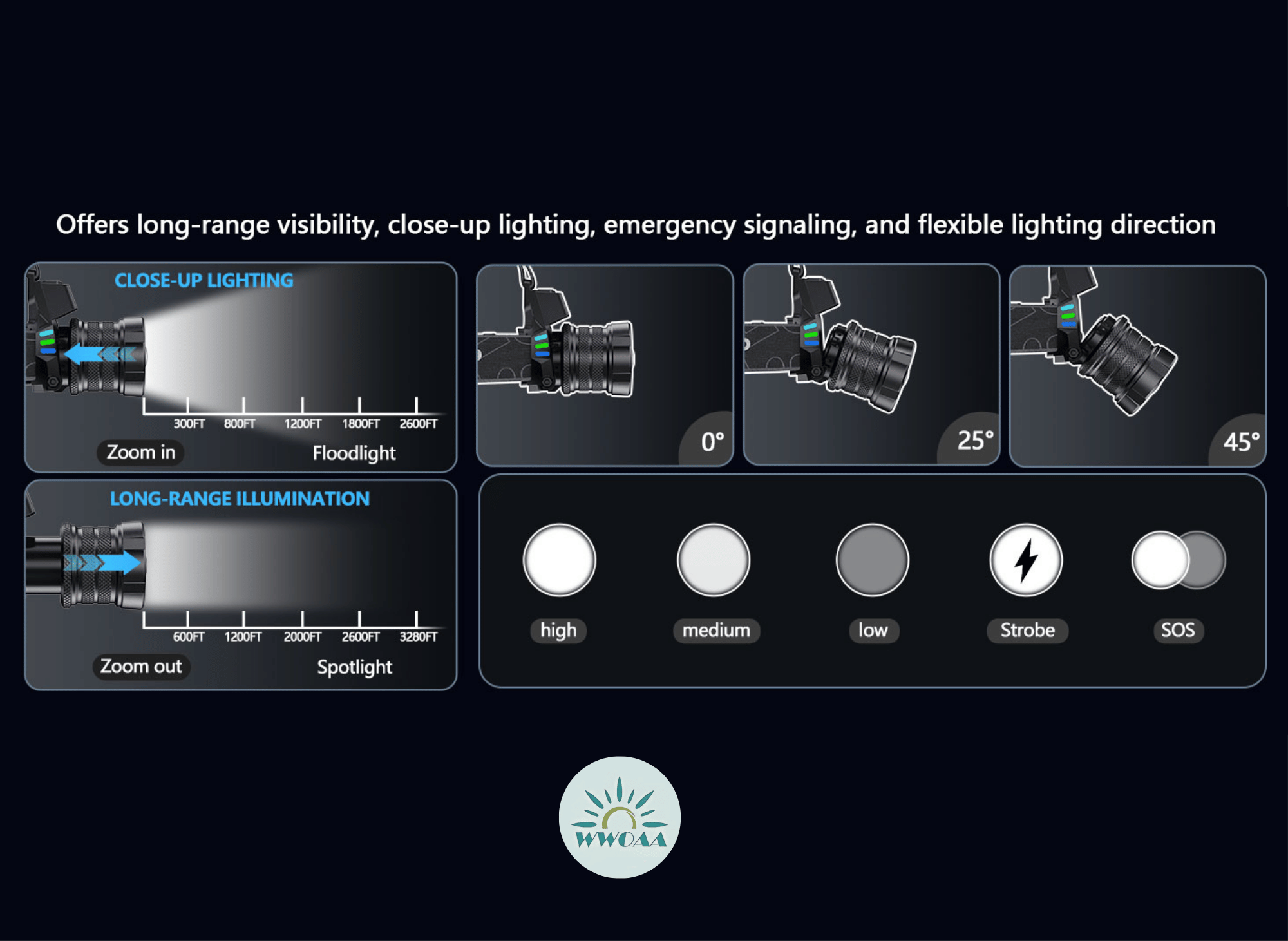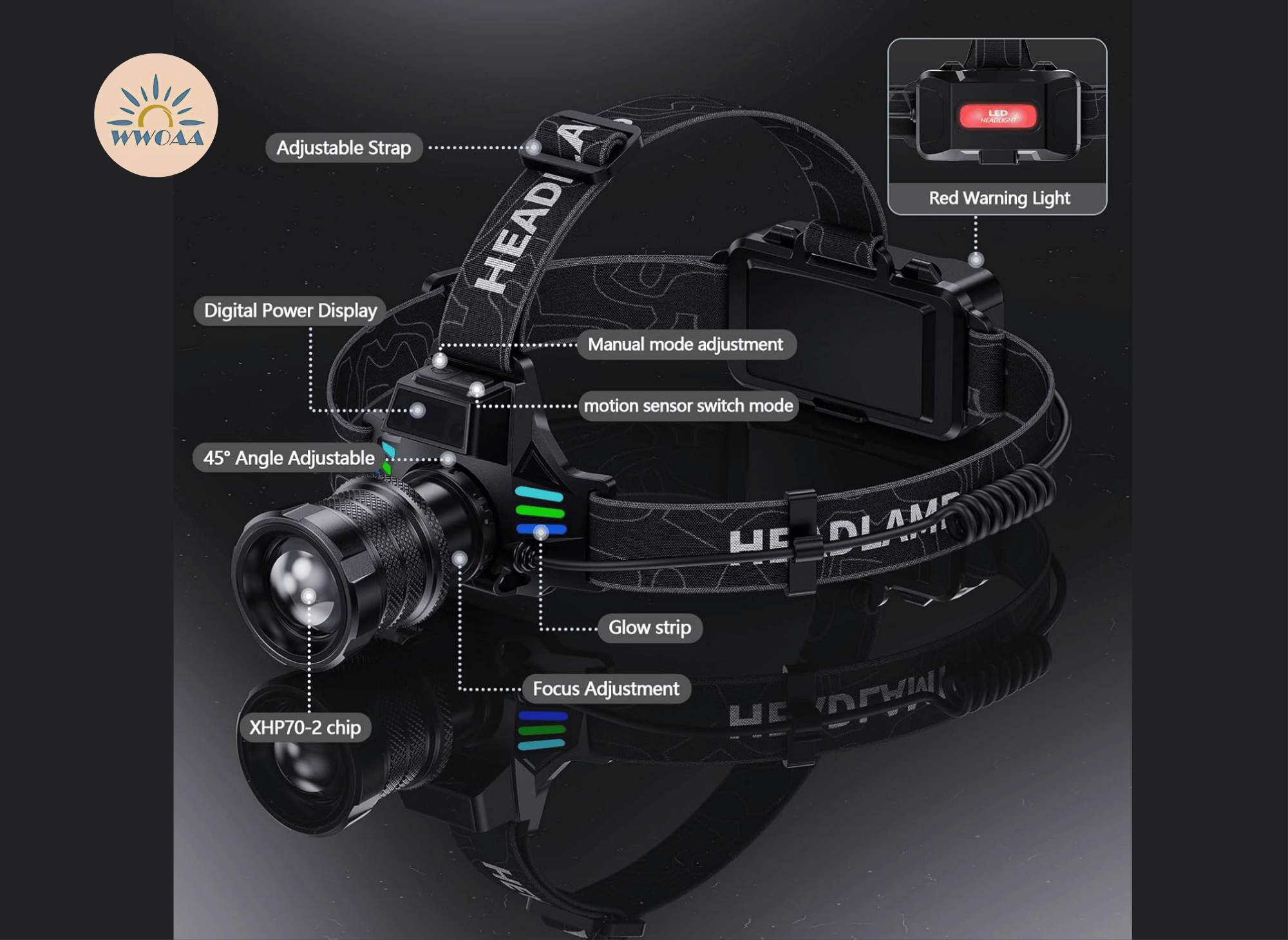 The WWOOA headlamp has advanced safety features, including a motion sensor that automatically turns on the light when movement is detected. Its bright and adjustable lighting modes ensure maximum visibility, making it easier to navigate through darkness.