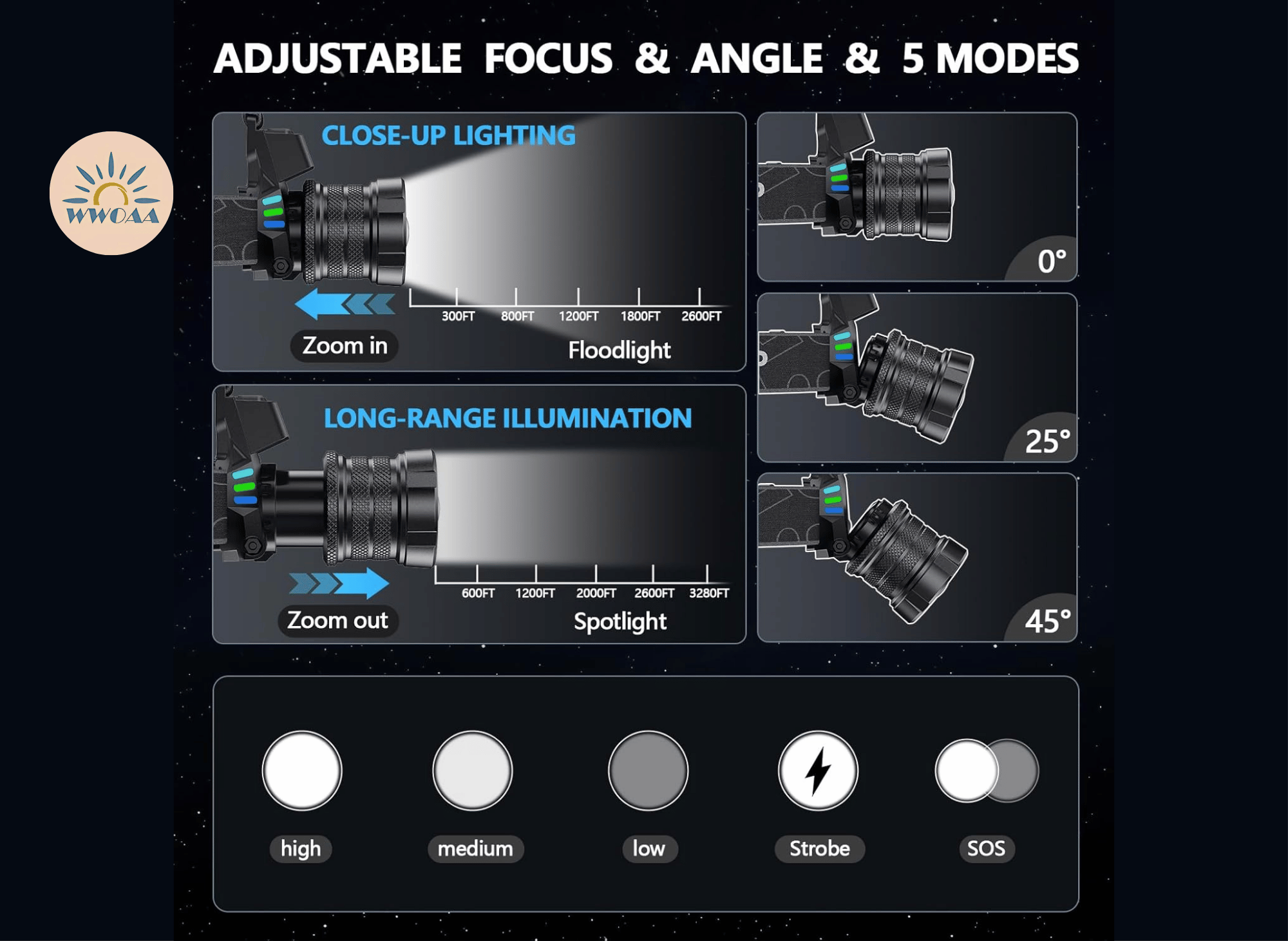 The WWOOA headlamp is a high-performance, lightweight rechargeable headlamp designed for outdoor enthusiasts and adults who require a reliable light source for nighttime activities. With its adjustable headband and motion sensor, this headlamp provides hands-free convenience and adjustable brightness settings to suit various needs.