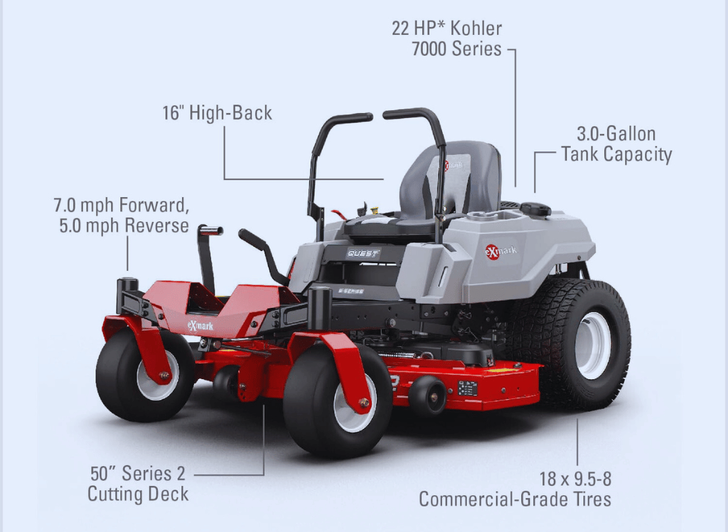 - Powerful Performance: Equipped with a robust 22-hp Kohler® engine, the Quest E-Series provides reliable and efficient cutting power for any lawn.