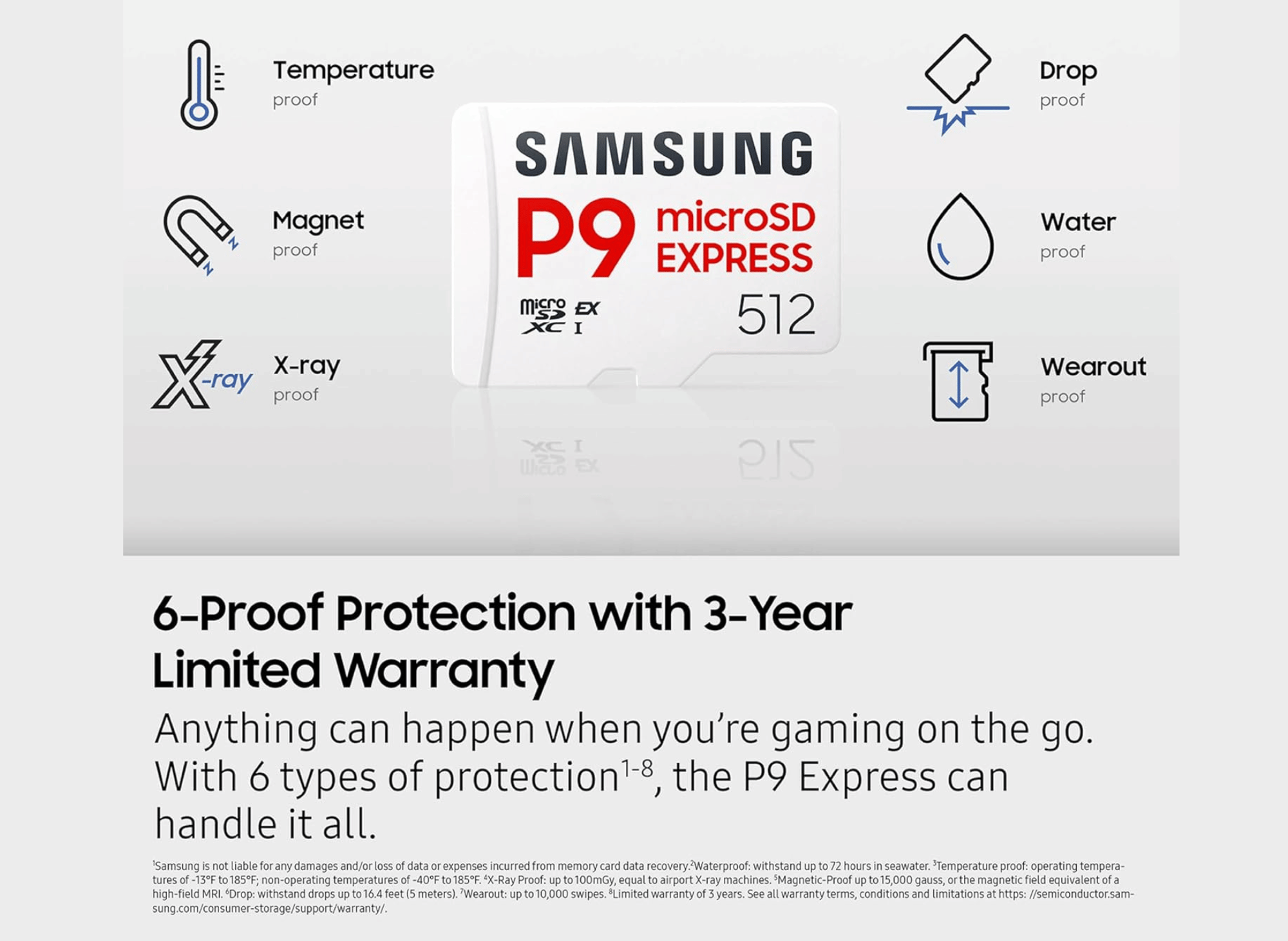 Speed is essential, but a storage card is only as good as its reliability. Samsung’s "6-Proof Protection" ensures the P9 Express can handle almost anything you throw at it.