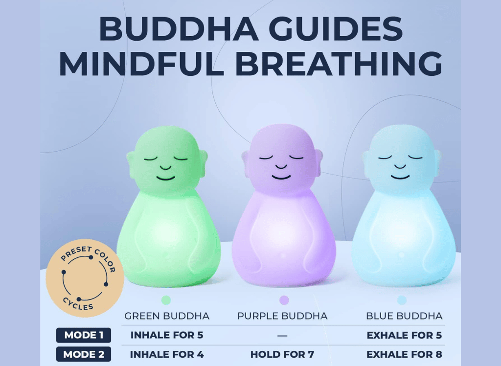 With two easy-to-use modes, this tool makes it effortless for you to incorporate short moments of guided breathing into your day. The color prompts, inspired by the popular 4/7/8 or 5/5 'calming breath', provide a soothing visual aid to guide you through each breath. Simply follow the green Buddha for your inhale, the purple Buddha for holding your breath, and the blue Buddha for exhaling.