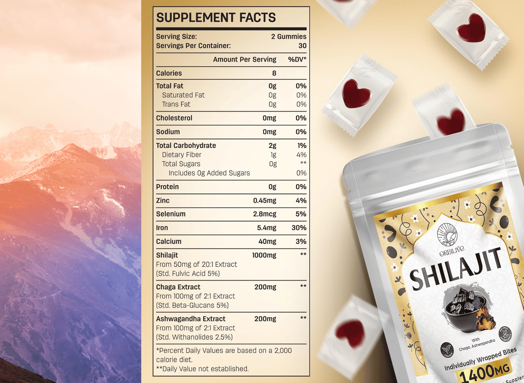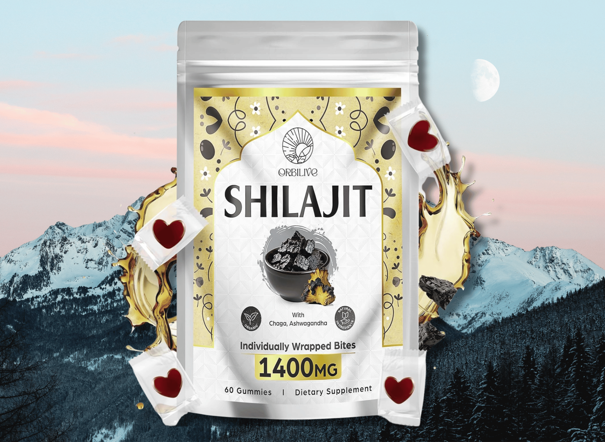 ORBILIVE Shilajit Pure Himalayan Organic Gummies - the perfect daily supplement for those seeking a natural and effective way to boost energy, improve recovery from workouts, and support overall wellness. These gummies deliver 1400mg of pure and organic shilajit sourced directly from the pristine mountains of the Himalayas.