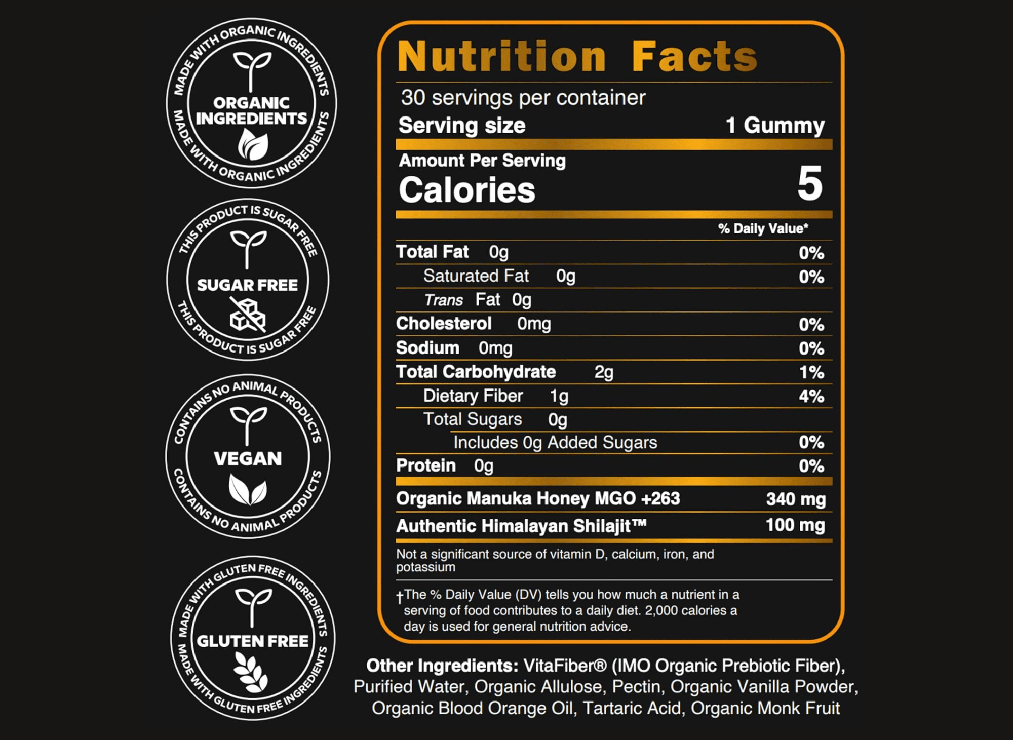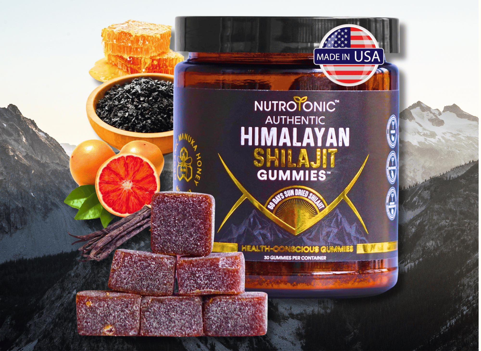 With each container containing 30 delicious gummies, their recommended 1-2 gummies daily provides a month or more of top-quality shilajit. These gummies are sweetened with organic manuka honey and flavored with organic vanilla beans and blood orange oil, providing a unique and enjoyable taste without unhealthy additives. These gummies are vegan-friendly and do not contain cane sugar, artificial colors, or other harmful ingredients.