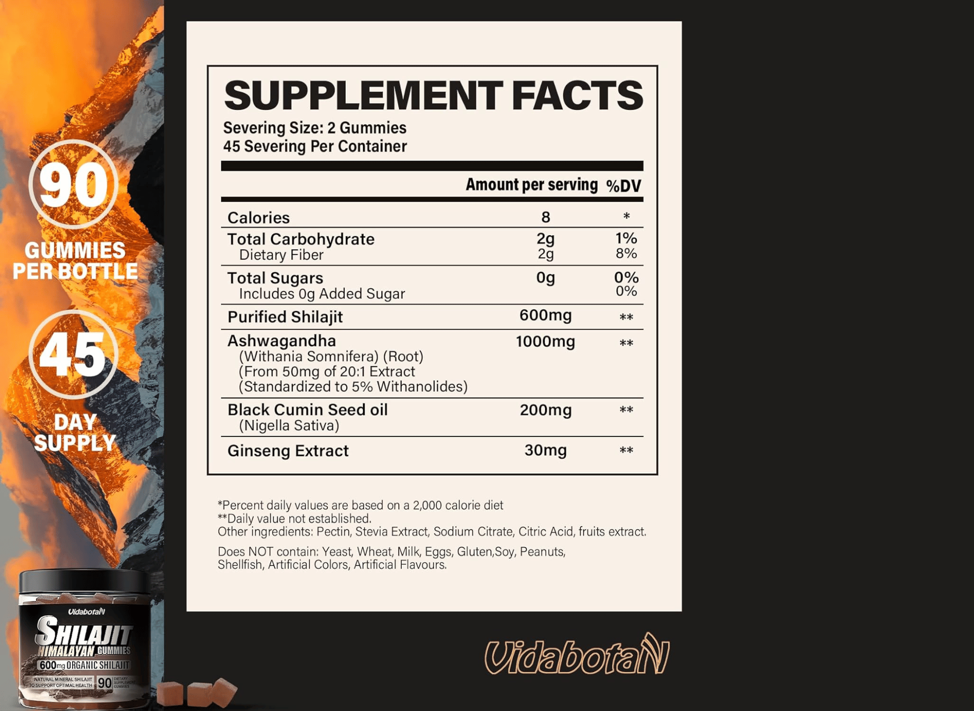 Vidabotan Shilajit Gummies is a premium formula for maximum efficacy and immune support. Each bottle contains 90 vegan gummies, 600mg of purified Shilajit per serving, 1000mg of Aswagandha, 200mg of Black Seed Oil, and 30mg of Ginseng. , those seeking natural and healthy options.