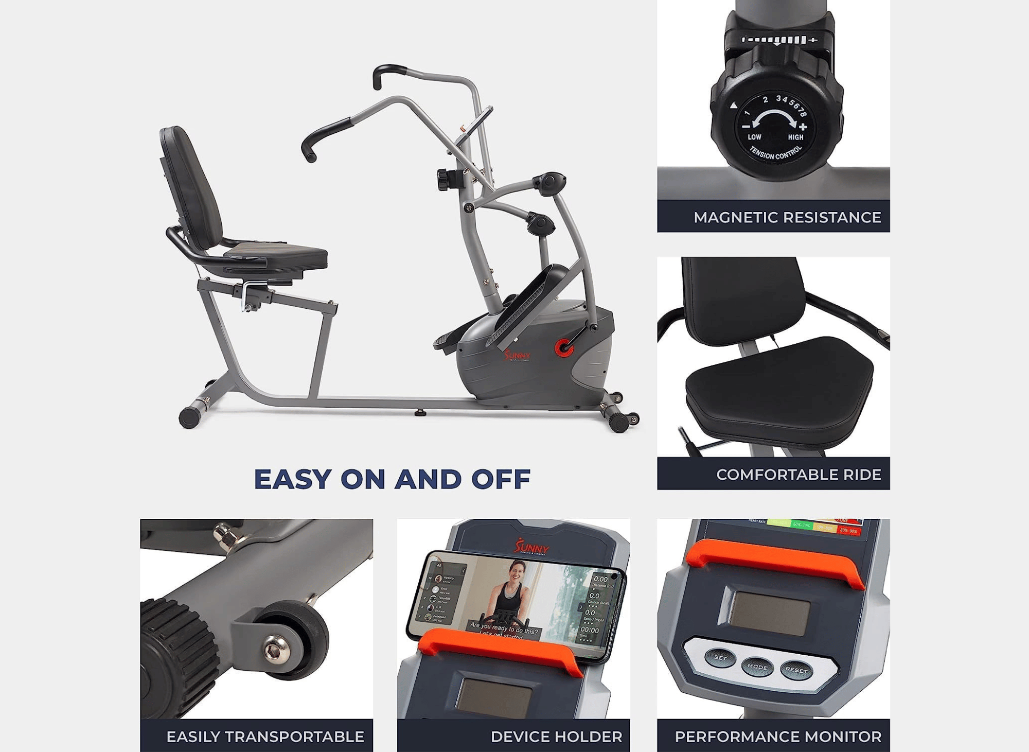 Recumbent bikes are perfect for everyone, regardless of age or fitness level. They’re user-friendly, easy to get on and off, and require minimal setup. Whether you’re a beginner or an athlete, the Sunny Health and Fitness Recumbent Bike meets you where you are. The step-through design enhances usability by allowing safe and easy mounting and dismounting, making it particularly appealing for users with mobility concerns or those new to fitness routines.