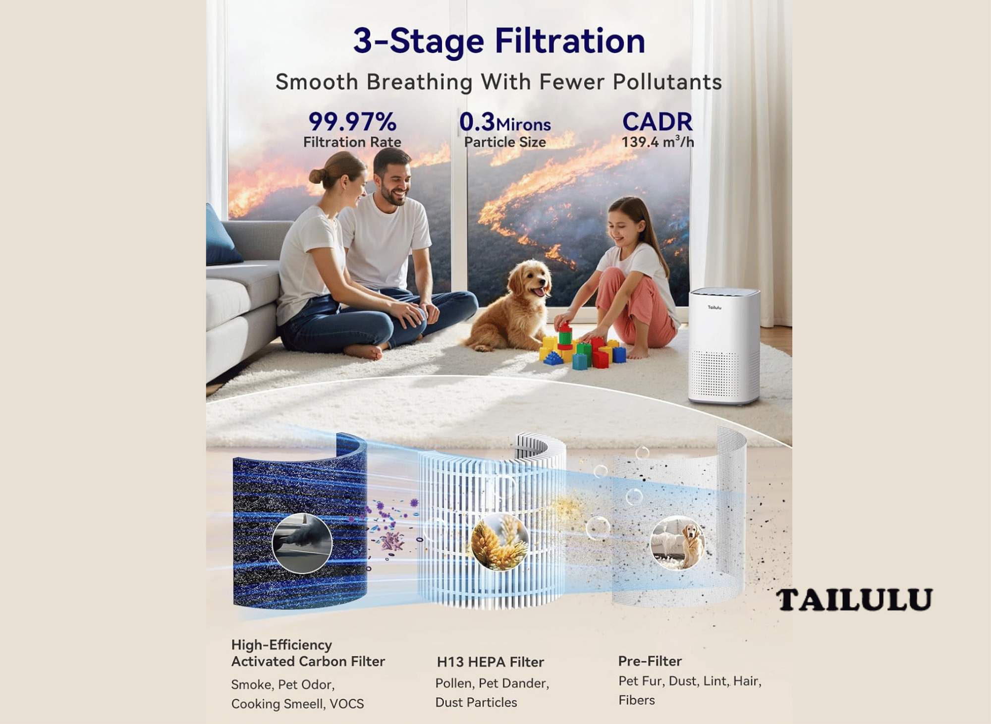 If you share your home with pets, you know that pet dander, hair, and even lingering odors can quickly affect indoor air quality. Air purifiers for home use, especially those equipped with H13 true HEPA air filters like the Tailulu H13 True HEPA Air Cleaner, are a game-changer for pet owners, especially those with a child lock button for added safety . These devices are specifically designed to capture pet dander, smoke, and other airborne particles, helping to reduce allergens and keep your living space smelling fresh.