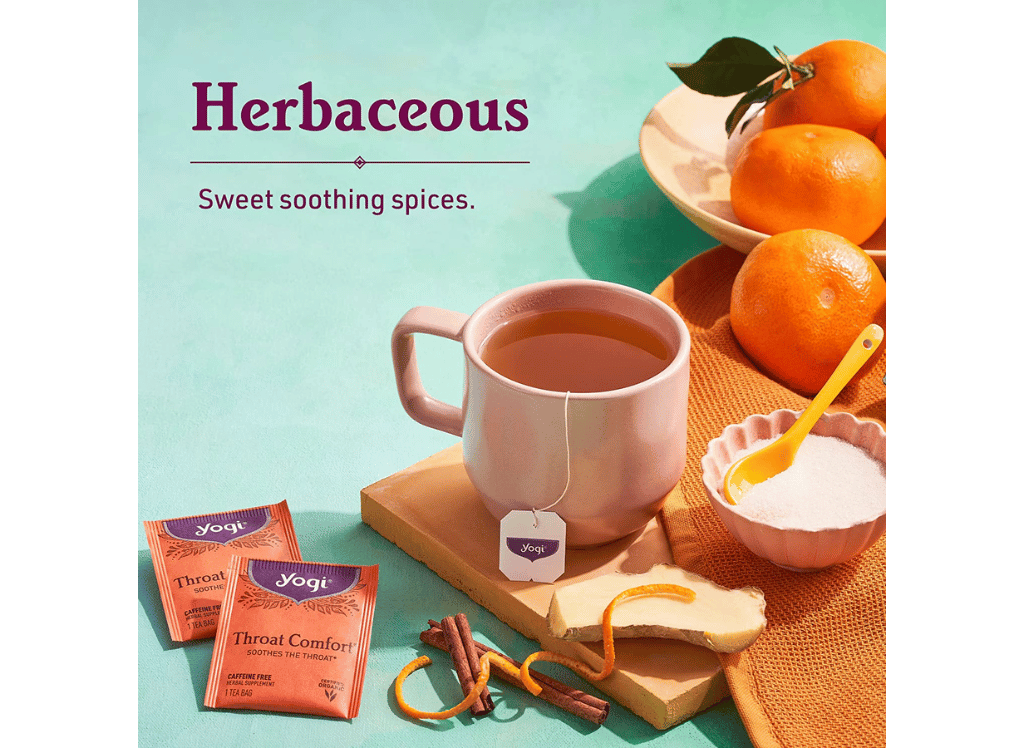 Yogi Throat Comfort Tea is a soothing and sweet herbal blend made with USDA Certified Organic ingredients that are Non-GMO Project Verified. Its calming formula combines Wild Cherry Bark, fragrant Orange Peel, Licorice Root, and Slippery Elm Bark to help relieve minor throat irritation. This caffeine-free tea is vegan, kosher, gluten-free, and free from artificial flavors or sweeteners. For added convenience, the tea bags are individually packaged in compostable bags for a quality product you can feel good about enjoying.