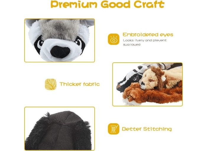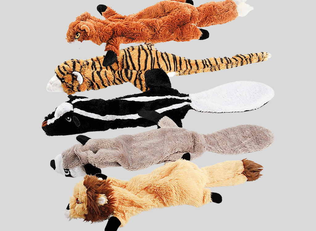 Does your pup need a special treat? Look no further than this assortment value bundle plush pet toy set. This set includes five big woodland animals -a raccoon, squirrel, tiger, fox, and lion- that provide ample entertainment and help to improve your furry pal’s health.