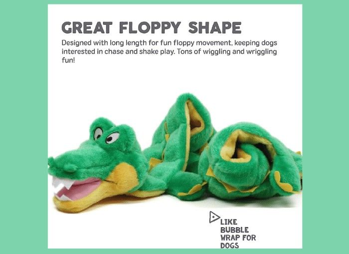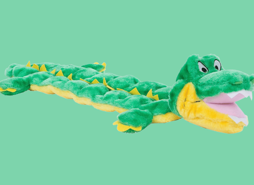 The Squeaker Matz line of dog toys is designed for pups who love to lay, tug, dig and bite squeaky toys. Specifically, the XL Gator toy comes with 16 built-in squeakers offering hours of playtime that won't easily be punctured through.