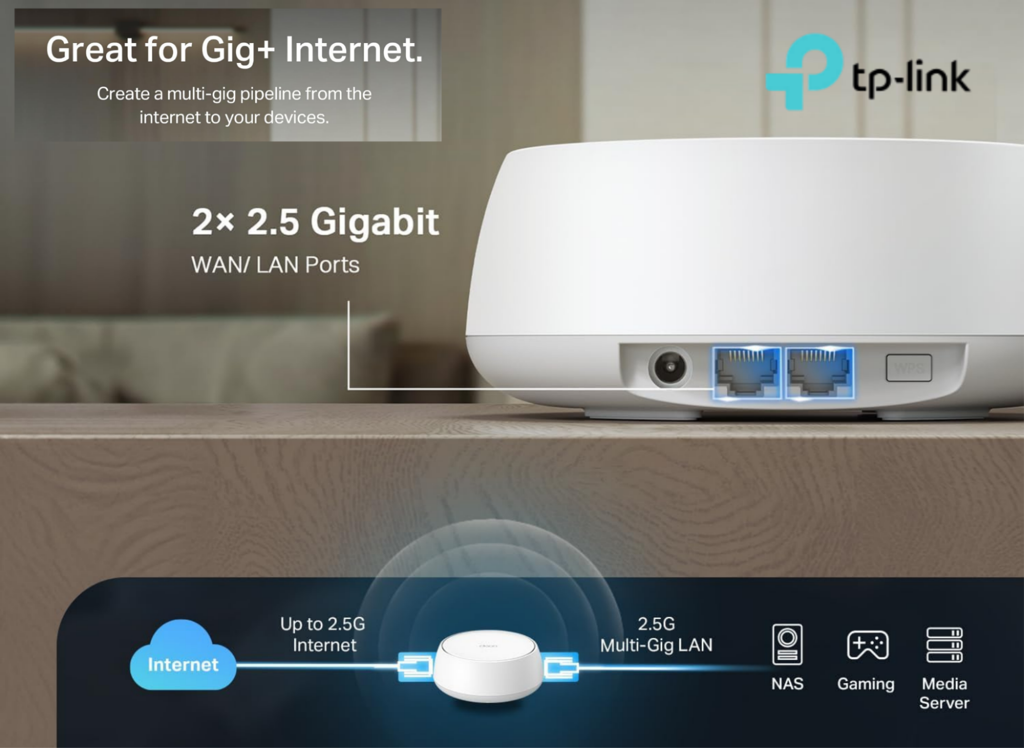 Wireless performance is highly important, but heavy data users still rely on hardwired connections for maximum stability. Each Deco BE23 unit comes equipped with two ultra-fast 2.5 Gbps WAN/LAN ports. You can use one port to connect to your multi-gig internet modem and use the remaining ports to connect desktop PCs, gaming consoles, or a network-attached storage (NAS) drive.
