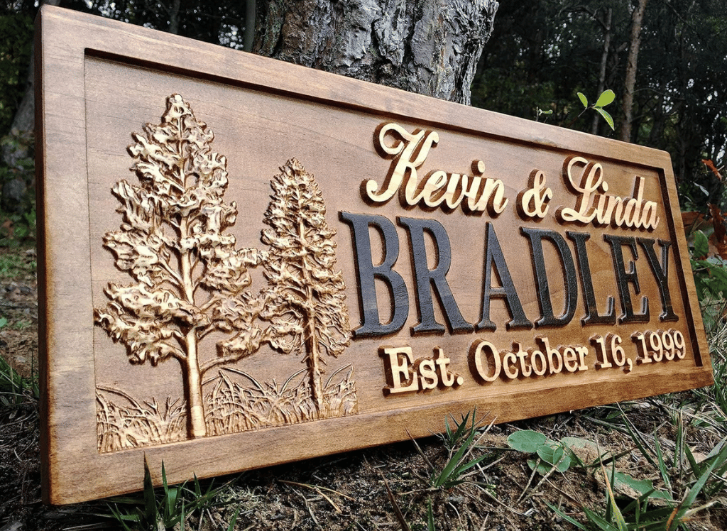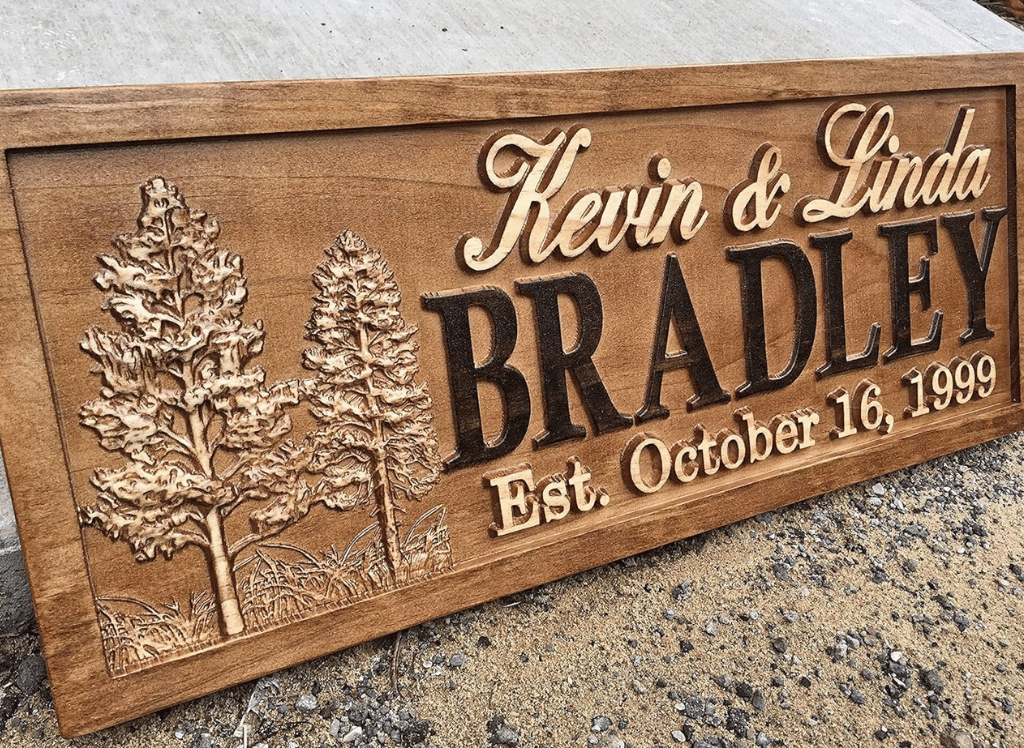 This rustic personalized wood sign with trees is a beautifully crafted piece made from high-quality materials. This unique sign features a two-tone stain finish on 3/4" solid pine, giving it a rustic yet modern look. The sign is then sealed for long-lasting protection and includes a convenient sawtooth hanger for easy hanging.