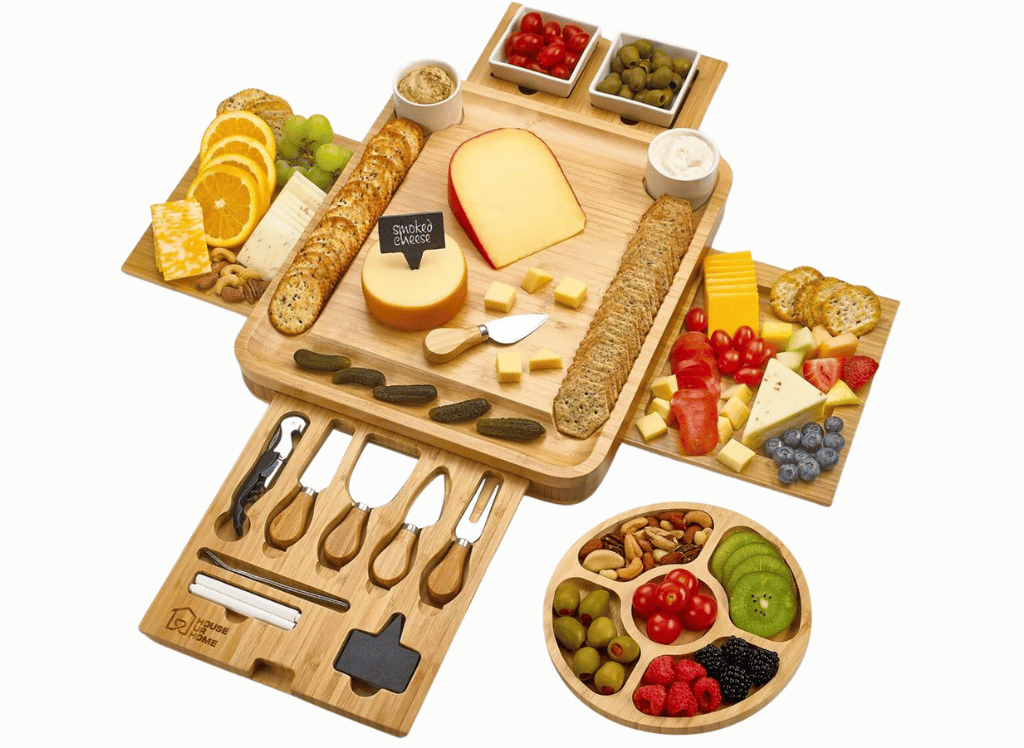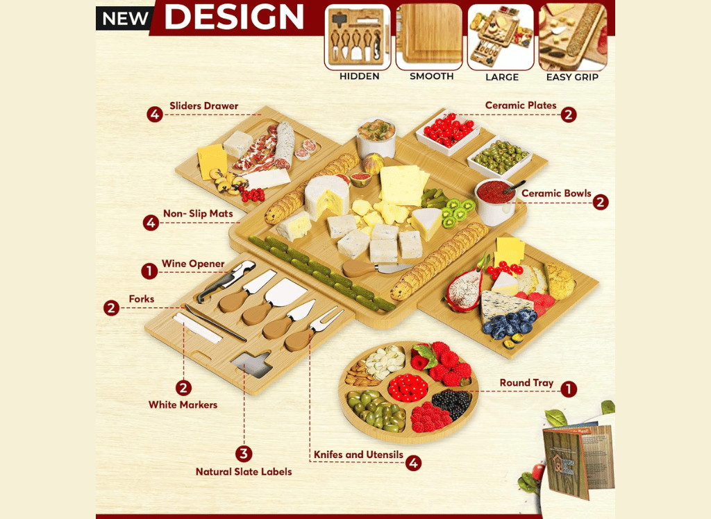 But what truly sets their cheese board apart is the seamlessly integrated drawer that houses 4 slotted magnet compartments for storing serving utensils and spreaders. With stainless steel blades and bamboo handles, these utensils are both functional and aesthetically pleasing.