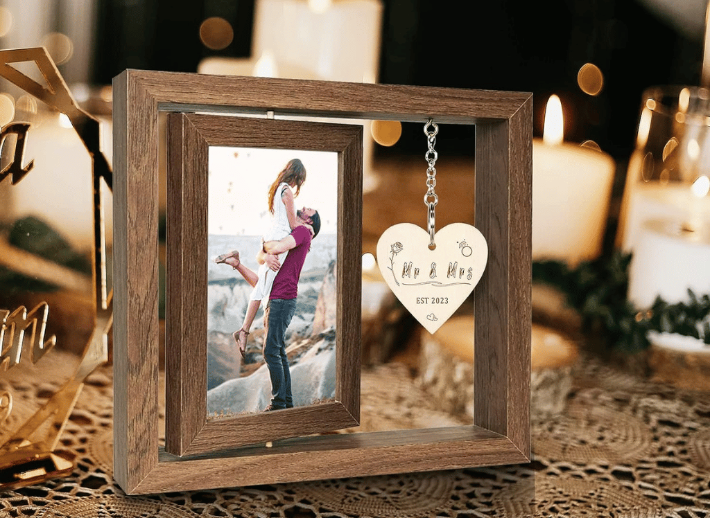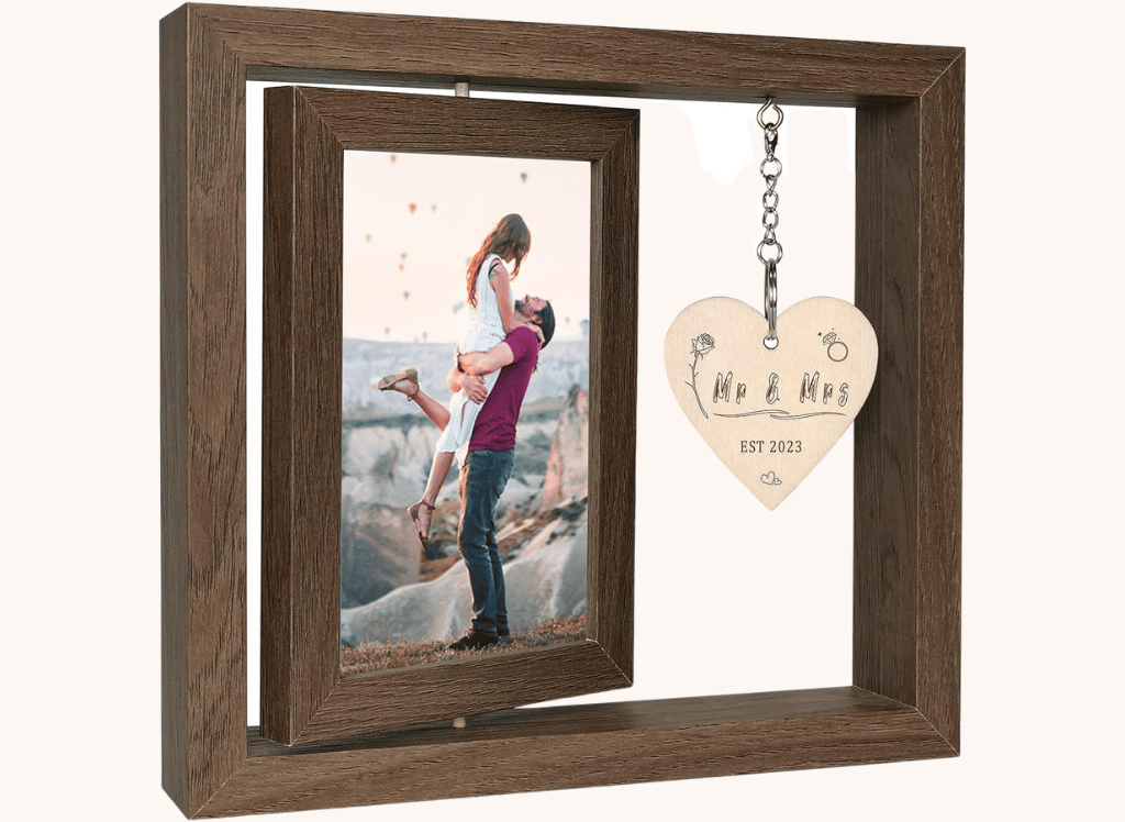 This 360-degree rotating floating picture frame is the perfect wedding gift for couples. Made of lightweight wood with a unique vintage wood texture finish and a real glass cover, these frames make for an elegant and high-quality gift option.