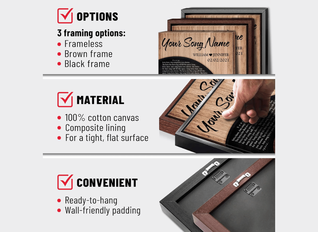 The personalized canvas frames are designed with convenience in mind, making them easy to hang and use. Every purchase comes with a hanging kit so you can quickly and effortlessly display your chosen song lyrics or images.
