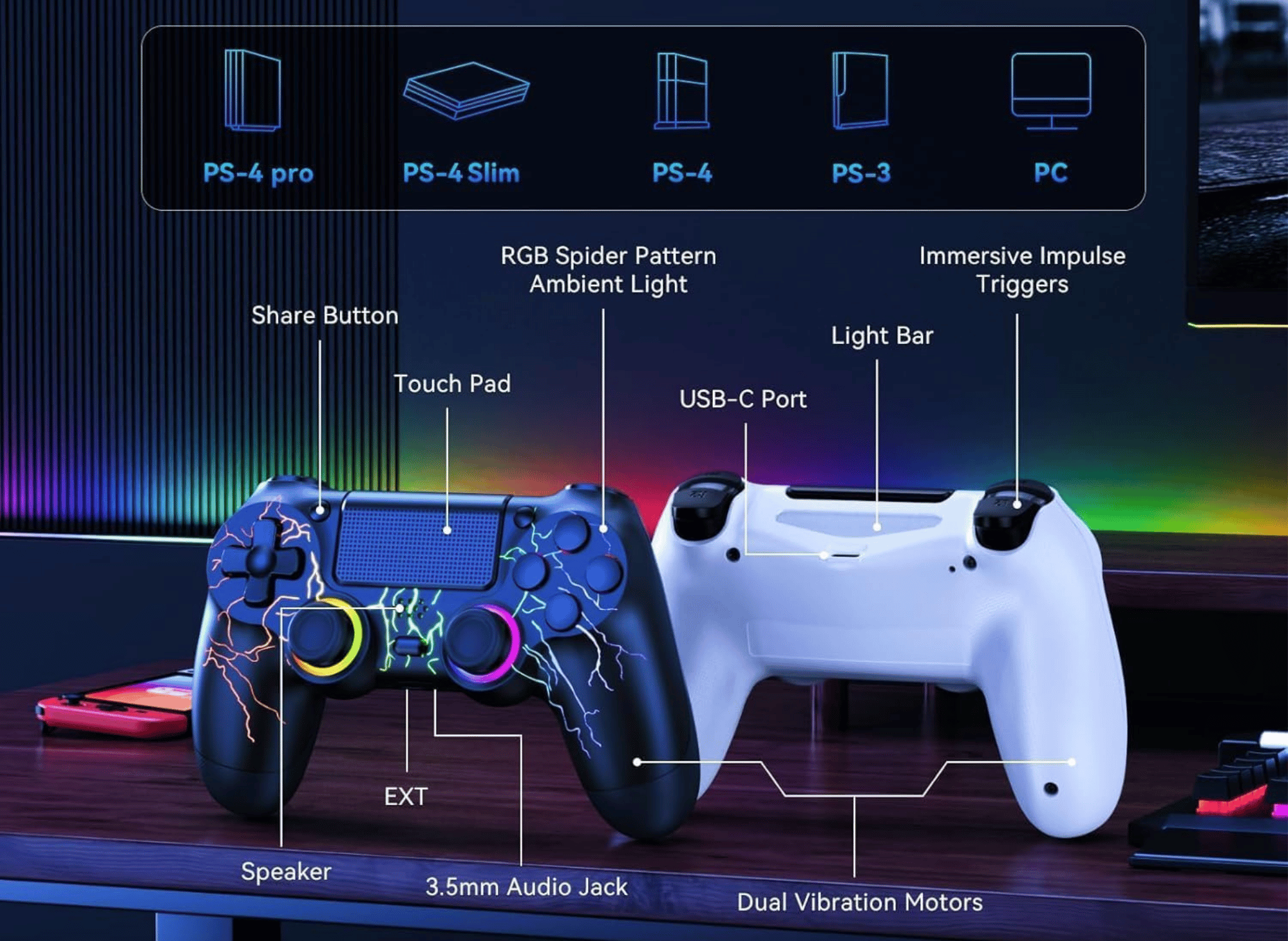 Slim/Pro/PC with Led RGB Light-up,Hall Effect Joystick,Type-C Port,1000mah Battery,Vibration,6-Axis Sensor,Audio Jack