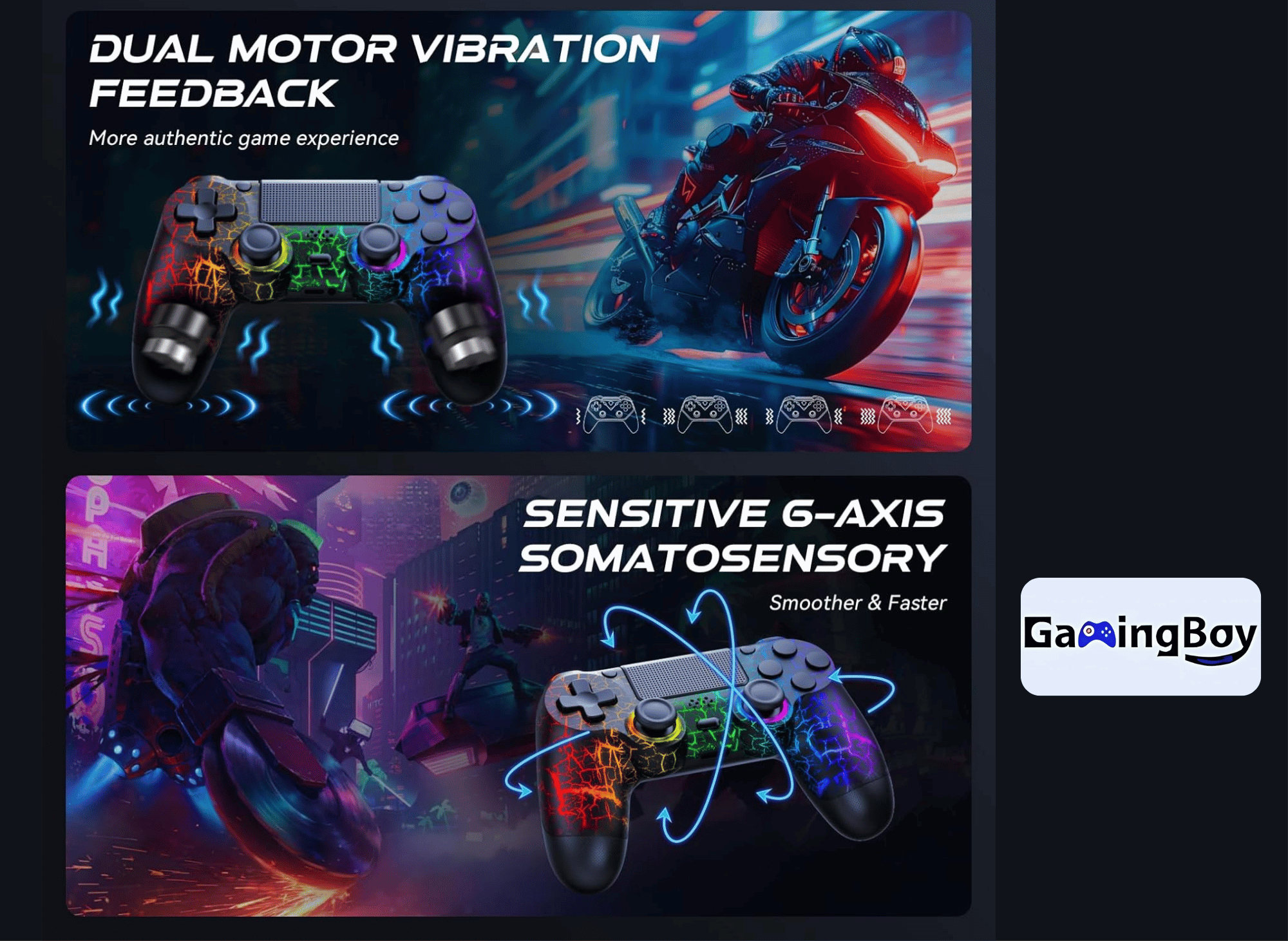 The dual vibration motors add immersive feedback, while the six-axis gyro sensor enhances motion control, making the controller feel great in your hands and improving the tactile and ergonomic experience.